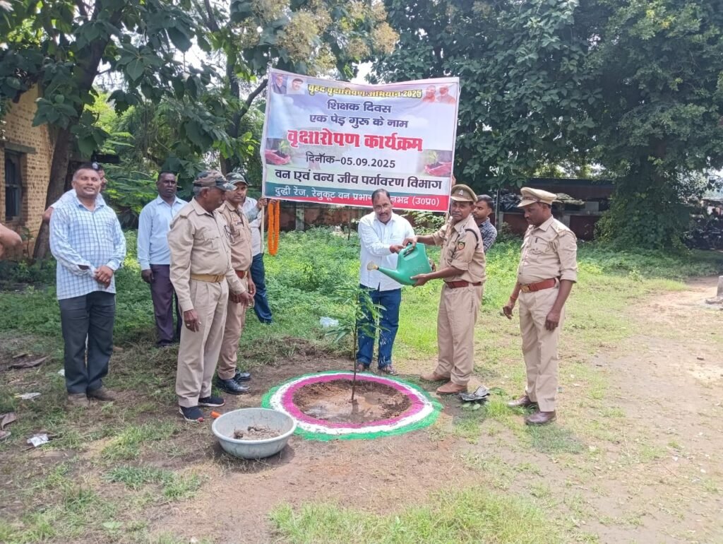 5 सितंबर शिक्षक दिवस पर माननीय मुख्यमंत्री योगी आदित्यनाथ जी के निर्देशन में आज 5 सितंबर 2025 को शिक्षक दिवस पर वन प्रभाग बाघडू के विश्राम गृह में गर्जन राम वन क्षेत्र अधिकारी दुद्धी एवं पूर्व विधायक हरिराम चेरो द्वारा गुरु के सम्मान में “एक पेड़ गुरु के नाम ” पौधा रोपण कर शिक्षक रामरक्षा (सहायक अध्यापक) कंपोजिट विद्यालय दिघूल को सम्मानित किया। अवसर पर दुद्धी वन रेंजर के वन दरोगा हीरालाल , माधव राम ,अनिल सिंह ,सुरेंद्र यादव ,कन्हैया लाल, वनरक्षक सूरज यादव ,अनिल कुमार, राम उग्र शंभू नाथ ,सेवानिवृत नारायण गुप्ता , अमरनाथ प्रजापति, प्रदीप कुमार, अंबिका प्रसाद ,अशोक कुमार, संजय,चंद्रशेखर सहित समस्त स्टाफ उपस्थित रहे।