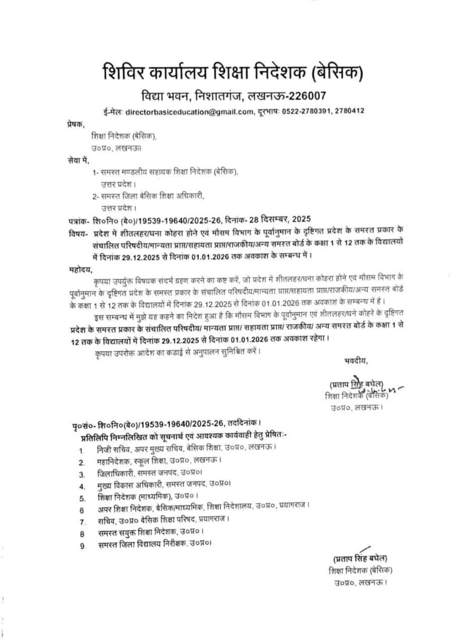 उत्तर प्रदेश में शीतलहर एवं घने कोहरे की गंभीर स्थिति को देखते हुए बेसिक शिक्षा निदेशक द्वारा बड़ा निर्णय लिया गया है। मौसम विभाग के पूर्वानुमान के अनुसार प्रदेश में अत्यधिक ठंड की संभावना को ध्यान में रखते हुए कक्षा 1 से 12 तक के सभी विद्यालयों में अवकाश घोषित किया गया है।