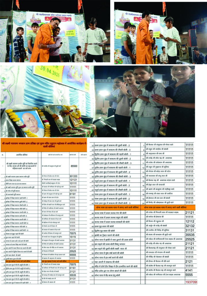 प्राण प्रतिष्ठा एवं पंच कुंडीय यज्ञ दिनांक 30 अप्रैल 2025 से 4 मई 2025 तक पांच दिवसीय रहेगा। इस बोली कार्यक्रम में भगवान के भक्तों द्वारा बढ़-चढ़कर हिस्सा लिया गया नवीन श्री लक्ष्मी नारायण मंदिर समिति ने सभी भक्तों से निवेदन किया है इस भव्य आयोजन में पधार कर धर्म लाभ लेवे साथ ही बोली लगाने वाले सभी भक्तों का आभार प्रकट किया।