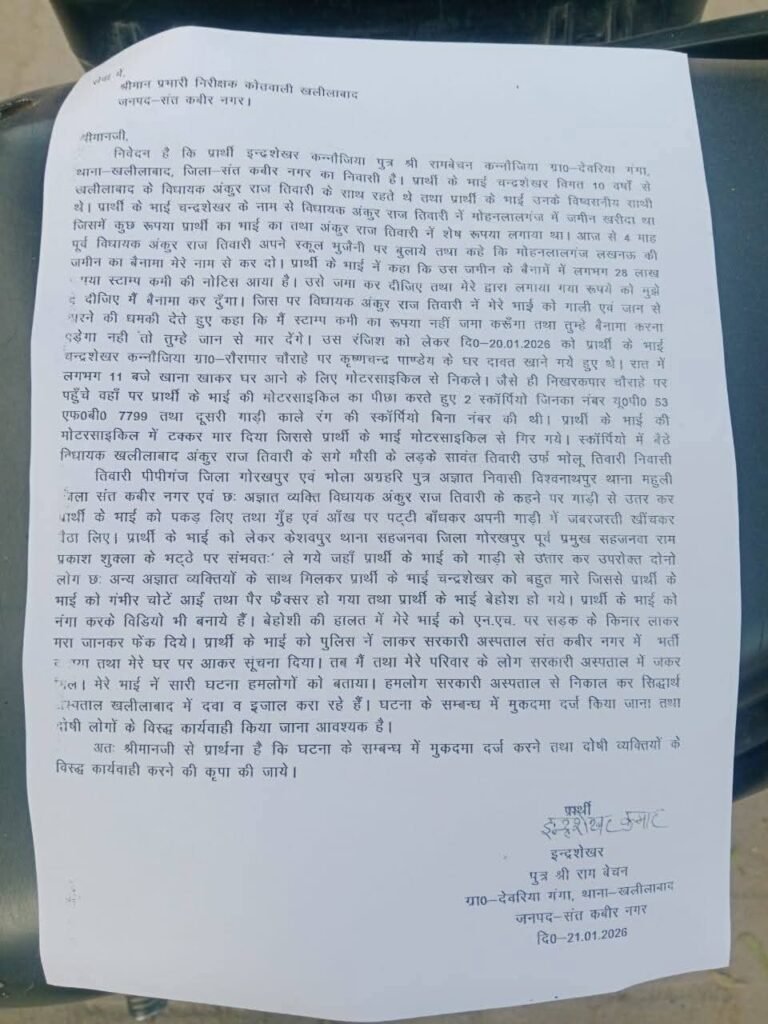 जानकारी के अनुसार थाना खलीलाबाद क्षेत्र के ग्राम देवकिया गंगा निवासी चंद्रशेखर कन्नौजिया 20 जनवरी 2026 की रात लगभग 11 बजे मोटरसाइकिल से कहीं जा रहे थे। इसी दौरान दो स्कॉर्पियो सवारों ने उनकी बाइक में टक्कर मार दी। आरोप है कि इसके बाद उन्हें जबरन गाड़ी में बैठाकर बुरी तरह पीटा गया।