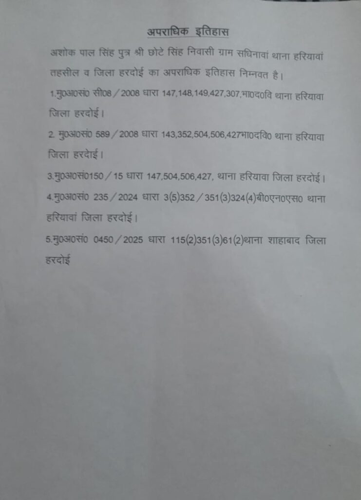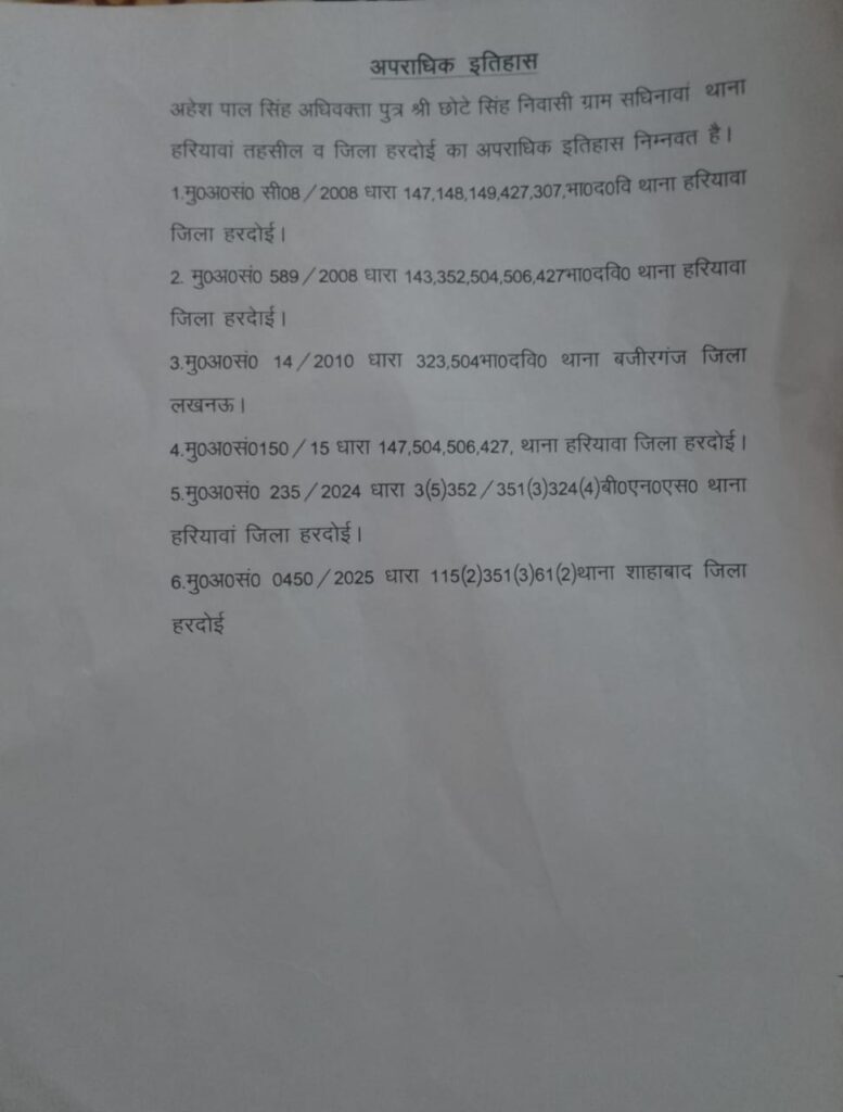 प्रभू जी ने बताया है कि अहेश पाल सिंह पुत्र छोटे सिंह ग्राम सधिनावां थाना हरियावां जिला हरदोई का रहने वाला है यह भू-माफिया है और इस पर 6 मुकदमे चल रहे हैं व इसके दोनों पुत्र अनुज प्रताप सिंह व अजीत प्रताप सिंह के ऊपर भी 5-5 मुकदमे चल रहे हैं लाइसेंसी बंदूकें एवं अनुज प्रताप सिंह के नाम लाइसेंसी रायफल एवं रिवाल्वर है उसका भी लाइसेंस निरस्त की जाए और अहेश पाल सिंह पुत्र छोटे सिंह के भाइयों विरेन्द्र सिंह, अशोक पाल सिंह के भी ऊपर 5-5 मुकदमे चल रहे हैं तब भी लाइसेंसी बंदूकों का लाइसेंस निरस्त नहीं की जा रही है इन का लाइसेंस निरस्त किया जाएं, वीडियो में देखें कि कहां कहां मुकदमे चल रहे हैं।