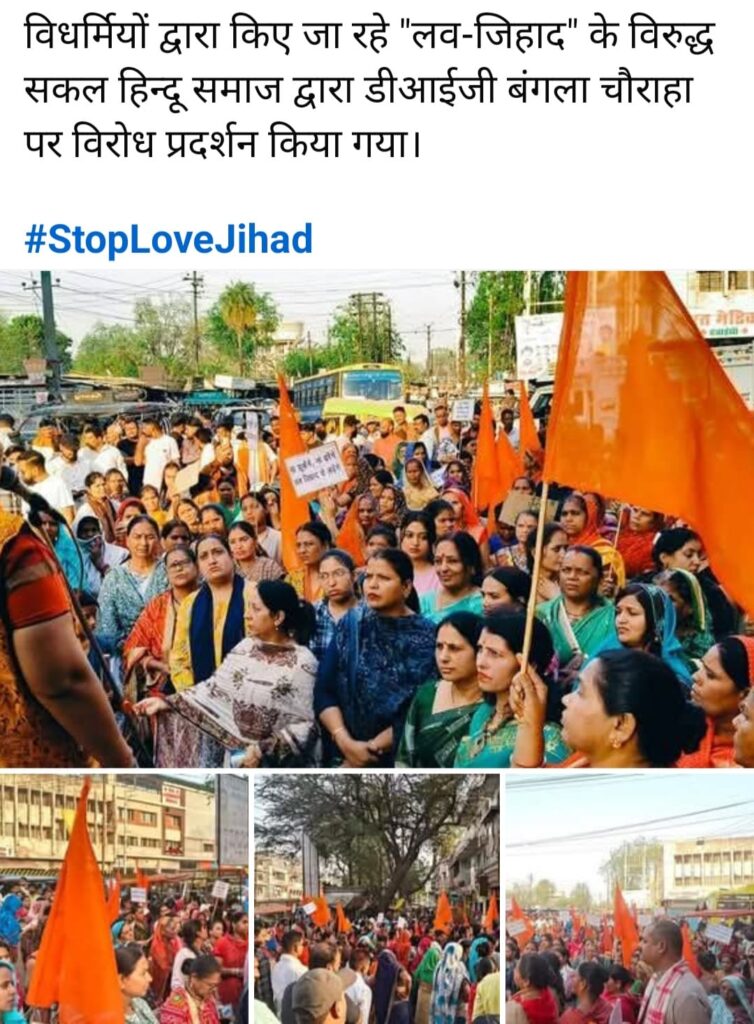 राजधानी भोपाल में बढ़ते लव जिहाद के मामले के विरोध में सकल हिंदू समाज ने आज भोपाल में 26 जगह पर विरोध प्रदर्शन किया, सकल हिंदू समाज की महिलाओं ने मांग की दोषियों को फांसी की सजा दी जाए, भोपाल की जहांगीराबाद चौराहे पर सैकड़ो महिलाओं ने अपना विरोध दर्ज कराया