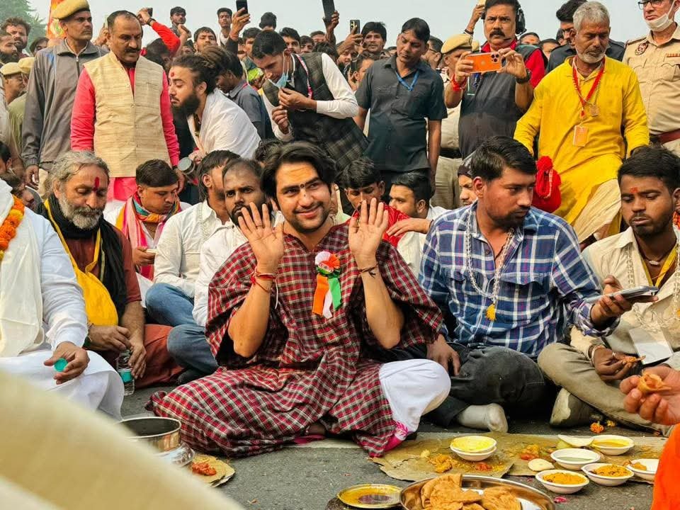 कमर से नीचे दिव्यांग की ललक हुई पूरी, महाराज ने दिया आशीर्वाद,कमर से नीचे पूरी तरह से दिव्यांग एक व्यक्ति महाराज श्री की झलक पाने को बेताब था लेकिन जैसे ही महाराज श्री की नजर पड़ी उन्होंने उसे तुरंत बुलाया और आशीर्वाद दिया। पलवल निवासी कर्मवीर नाम का युवक कमर के नीचे पूरी तरह से दिव्यांग है, हाथों के सहारे वह चलता है। अत्यधिक भीड़ होने के बावजूद महाराज श्री की उस पर नजर पड़ गई। कर्मवीर को बुलाकर वे स्वयं जमीन पर उसके साथ बैठ गए।सफाई कर्मियों के साथ समरसता भोज, रस्सा पार्टी सागर मंडल के साथ चाय ,बागेश्वर महाराज यात्रा के माध्यम से समरसता का संदेश भी फैला रहे हैं। सफाई कार्य में लगे लोगों के साथ सड़क पर ही बैठकर महाराज श्री ने सुबह भोजन किया। यात्रा के कुछ दूर चलने के बाद उन्होंने रस्सी के माध्यम से भीड़ को नियंत्रित करने में जी तोड़ मेहनत कर रहे सागर शिष्य मंडल के साथ बैठकर उन्होंने चाय पी। जय श्रीराम का उद्घोष बढाता पदयात्रियों का जोश