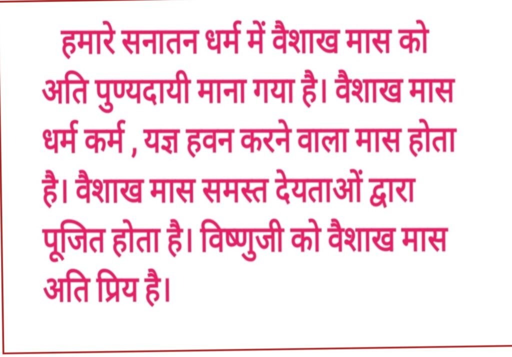 सनातन धर्म के अनुसार वैशाख मास को अत्यंत पुण्यदायी मास माना गया है। वैशाख के इस महिने में अक्षय तृतीया, जानकि नवमी, वरूथनी एकादशी, परशुराम जयंती, मोहनी एकदशी व्रत, बुद्ध पूर्णिमा आदि भी आते हैं। यह वैशाख मास धर्म कर्म, यज्ञ हवन आदि के लिए उत्तम माना जाता है। वैशाख का यह महिना सभी देयताओं के द्वारा पूजित है; भगवान नारायण श्रीहरि विष्णुजी को यह मास अति प्रिय है। इस बार 2026 में वैशाख मास का शुभारंभ 03 अप्रैल दिन शुक्रवार से हो रहा है, और यह वैशाख महिना 01 मई शुक्रवार को समाप्त होगा। ज्योतिषशास्त्र के अनुसार वैशाख के इस महिने में धन, अन्न, फल, वस्त्र, जल रखने का पात्र आदि दान धर्म करने का विशेष महत्व होता है। इस माह में ऋतु परिवर्तन के कारण सूर्य की गर्मी भी तीव्र हो जाती है। ऐसे समय में जल दान करना भी अत्यंत शुभदायी माना गया है। वैशाख के इस मास में नूतन कार्य जिसे कि नये घर का निर्माण कार्य आरंभ करना, वाहन खरीदना नये वसतुओं की खरीदारी आदि के लिए उचित समय रहता है। इस वैशाख मास में पवित्र तीर्थ स्थानो मे स्नान, व्रत पूजा, दान पुण्य, शुभ धार्मिक कार्य आदि करने पर शुभ फल की प्राप्ति होती है। वैशाख मास मे जानकि नवमी पर्व आता है जो कि जनक नंदनी जानकी जी का प्राकट्य उत्सव भी है। इस दिन सुहागिन माताएं बहने अपने सौभाग्य एवं पति की दीर्घायु कामनापूर्ति के लिए व्रत भी रखती हैं। वैशाख मास मे ही अक्षय तृतीया भी पड़ती है, इस दिन स्वर्ण आभूषण, रत्न आदि खरीदारी के लिए भी विशेष महत्व होता है। भविष्य पुराण के अनुसार अक्षय तृतीया के दिन सतयुग एवं त्रेतायुग का आरंभ और महाभारत युद्ध का अंत भी हुआ था। वैशाख मास मे ही बुद्ध पूर्णिमा का पर्व भी आता है, जो कि स्नान दान , माता लक्ष्मी जी श्रीहरि की पूजा के लिए उत्तम है। वैशाख का यह महिना हिन्दू पंचांग का एक अति पवित्र और विशेष महिना भी माना जाता है। वैशाख का यह महिना आमतौर पर अंग्रेजी माह अप्रैल मई के मध्य मे आता है। वैशाख मास को पुण्य अर्जन के लिए अच्छा समय भी माना जाता है। ऐसा माना जाता है कि इस माह मे किए जा ने वाले अच्छे कर्मों का फल कई गुना अधिक बढ़ जाता है। पवित्र वैशाख मास मे बच्चों का नामकरण संस्कार, मुंडन संस्कार, विवाह योग्य पुत्र, पुत्रि का विवाह करना भी शुभ माना जाता है। इस माह में नये घर का निर्माण कार्य शुरू करना, गृह प्रवेश आदि भी शुभ माना जाता है। वैशाख मास में सत्संग पूजा-पाठ आदि लाभदायक माना जाता है। वैशाख मास में नित्य प्रतिदिन भगवान विष्णुजी और माता लक्ष्मी जी की पूजा आराधाना करना, तुलसी के पौधे के समक्ष दीप प्रज्वलित करना, शिवलिंग का अभिषेक करना, जरूरतमंद प्यासे लोगों को पानी पिलाना, वस्त्र, घड़ा फलों का दान , जरूरतमंद लोगों को जूते-चप्पल आदि का दान करना अन