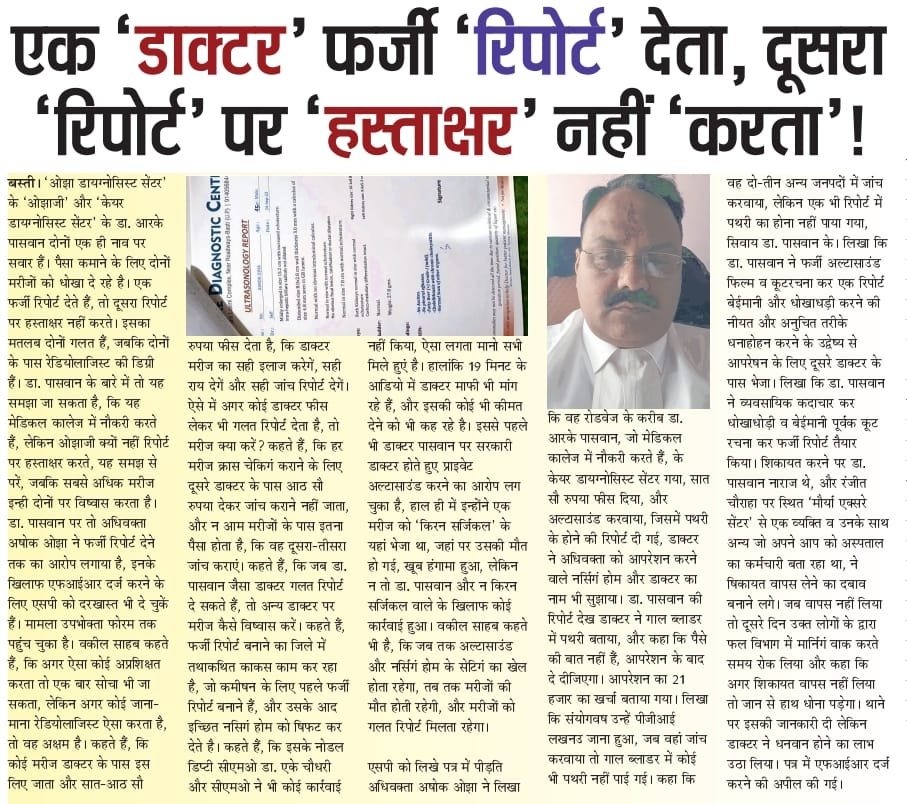 🚨अधिवक्ता की शिकायत ने खोली पोल: डॉ. आर.के. पासवान और ओझा डायग्नोस्टिक सेंटर के सिंडिकेट का पर्दाफाश।