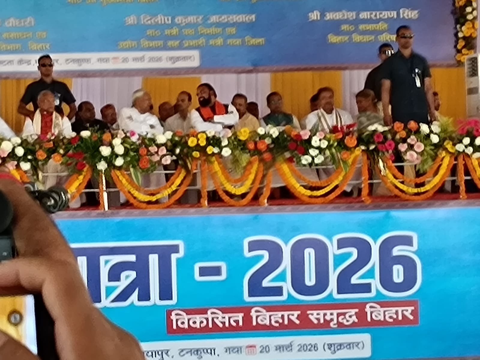 इस अवसर पर केंद्रीय मंत्री श्री जीतनराम मांझी, उप मुख्यमंत्री श्री सम्राट चौधरी, विधानसभा अध्यक्ष डॉ० प्रेम कुमार, जल संसाधन मंत्री श्री विजय कुमार चौधरी, उद्योग मंत्री सह जिले के प्रभारी मंत्री डॉ० दिलीप कुमार जायसवाल, विधायक श्री उपेंद्र प्रसाद, विधायक श्रीमती ज्योति देवी, विधायक श्रीमती मनोरमा देवी, विधायक श्री रोमित कुमार, श्री वीरेंद्र सिंह, विधान पार्षद श्रीमती कुमुद वर्मा सहित पूर्व विधायकगण, पूर्व विधान पार्षदगण, अन्य जनप्रतिनिधिगण एवं बड़ी संख्या में आमजन उपस्थित थे।