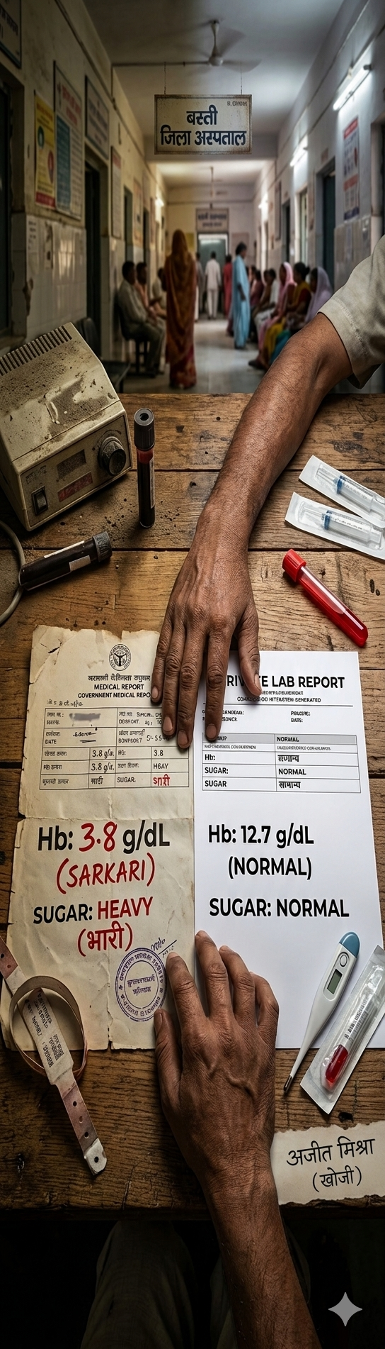 ताजा मामला कप्तानगंज ब्लॉक के एक मरीज जितेंद्र राजभर (24) का है। जिला अस्पताल की ‘हाई-टेक’ बायोकेमिस्ट्री मशीनों ने युवक का हीमोग्लोबिन मात्र 3.8 g/dL बता दिया। चिकित्सा विज्ञान के अनुसार, इस स्तर पर मरीज की स्थिति अत्यंत गंभीर होती है और उसे तत्काल खून चढ़ाने की जरूरत पड़ती है। तीमारदार बदहवास होकर खून के इंतजाम में जुट गए, लेकिन जब संदेह होने पर निजी पैथोलॉजी में जांच कराई गई, तो हीमोग्लोबिन 12.7 g/dL निकला।