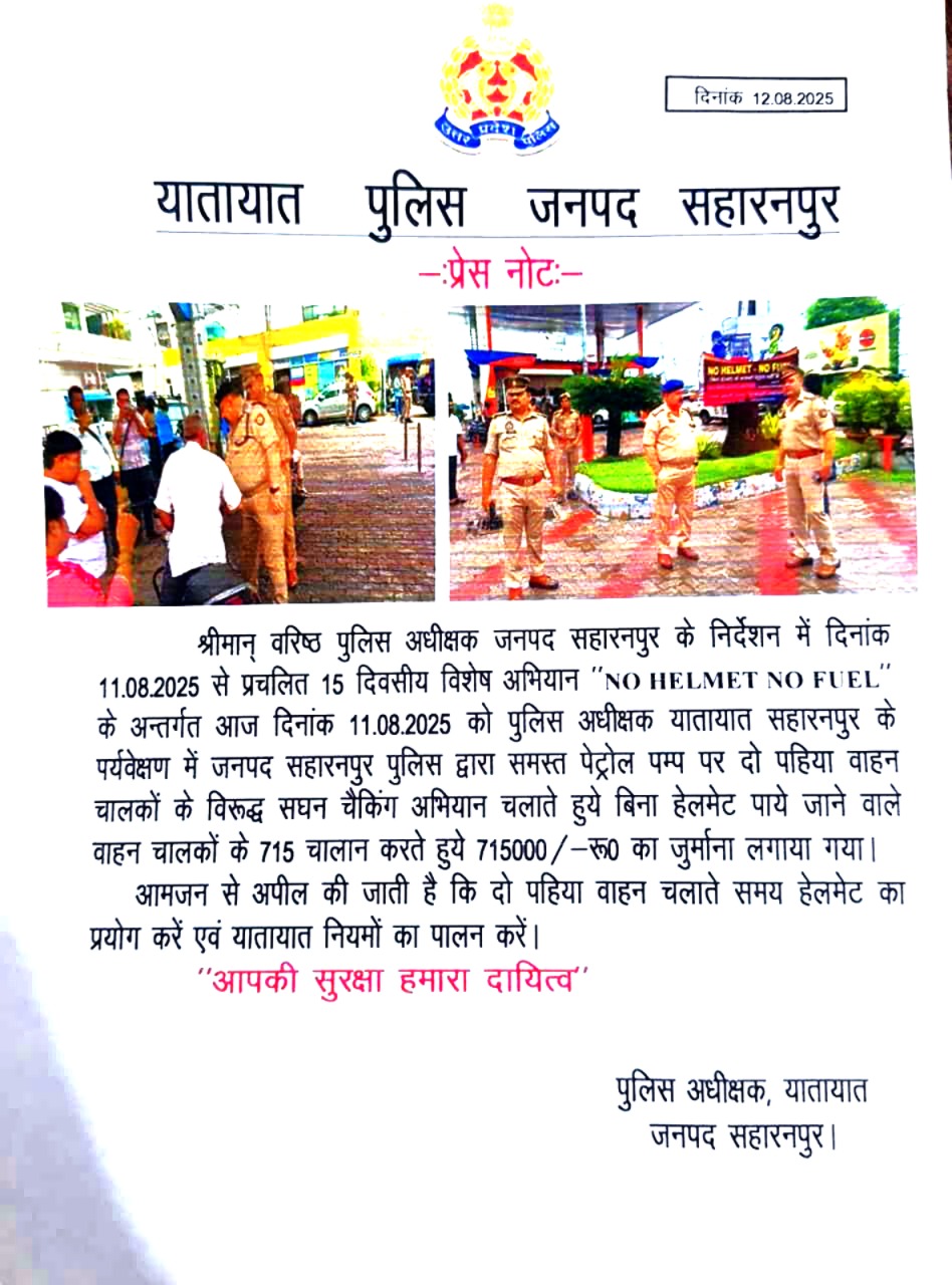 सहारनपुर –“नो हेलमेट – नो फ्यूल” अभियान में सहारनपुर पुलिस की सख्ती, 715 चालान, ₹71,500 जुर्माना वसूला