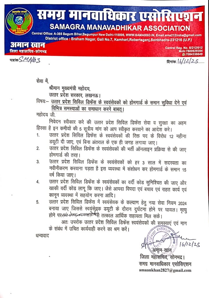सोनभद्र (राकेश कुमार कन्नौजिया)_उत्तर प्रदेश सिविल डिफेंस के स्वयंसेवकों की समस्याओं और उनकी मांगों को लेकर ‘समग्र मानवाधिकार एसोसिएशन’ ने मुख्यमंत्री योगी आदित्यनाथ को एक मांग पत्र भेजा है। एसोसिएशन के जिला महासचिव (सोनभद्र) अमान खान द्वारा भेजे गए इस पत्र में स्वयंसेवकों को होमगार्ड के समान सुविधाएं देने और उनके कल्याण के लिए नई नियमावली बनाने की पुरजोर वकालत की गई है