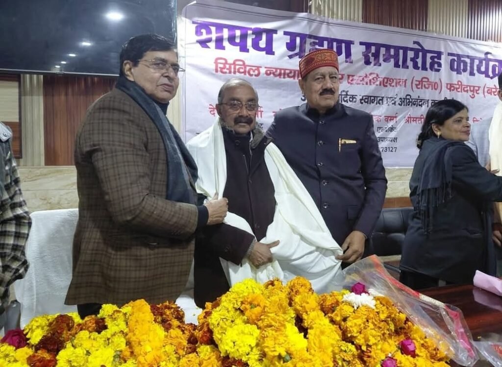 फरीदपुर (बरेली)। सिविल न्यायालय बार एसोसिएशन का द्विवर्षीय शपथ ग्रहण समारोह संपन्न हुआ जिसमें एल्डर कमेटी के अध्यक्ष नरेश कुमार चौधरी ने सिविल न्यायालय बार एसोसिएशन के अध्यक्ष जितेंद्र चौहान, महासचिव सुनीता मिश्रा सहित संपूर्ण कार्यकारिणी को शपथ दिलाई। जिसमें वरिष्ठ उपाध्यक्ष अशोक कुमार वर्मा, उपाध्यक्ष प्रवेश त्रिवेदी, कुलदीप शर्मा, संजीव कुमार सिंह नीटू, परितोष चौधरी, कोषाध्यक्ष सुमित वर्मा, संयुक्त सचिव रेखा आर्या , परमजीत, सम्राट सिंह, ऑडिटर धुरेंद्र पाल सिंह सहित वरिष्ठ और कनिष्ठ कार्यकारिणी के सदस्यों ने भी शपथ ली। विशिष्ट अतिथि एमएलसी कुंवर महाराज सिंह एवं जिला बार एसोसिएशन बरेली के नव निर्वाचित सचिव विशिष्ट अतिथि दीपक पाण्डेय का भव्य स्वागत किया और विशिष्ट अतिथि ने बिचार रखे। भव्य शपथ ग्रहण कार्यक्रम में एल्डर कमेटी के अध्यक्ष एवं मुंसिफ कोर्ट के संयोजक नरेश कुमार चौधरी, सदस्य देवदत्त शर्मा, राजेश चंद्र मिश्रा, आशु अग्रवाल, प्रोफेसर अलाउद्दीन खान, सतेन्द्र कुमार सक्सेना, अरविंद सिंह, अरुण तोमर, ओमवीर गुर्जर, मोहिनी शर्मा, अतुल शुक्ला, संजीव मिश्रा, अमित तोमर एडवोकेट पत्रकार, राकेश त्रिगुणायत, अनूप नारायन मिश्रा, सशींद चौहान, हरिशंकर अग्निहोत्री, शैलेश सिंह, संजय सिंह सोलंकी प्रधान, गौरव सक्सेना, अनूप गुप्ता, मुजम्मिल बेग, वीरेन्द्र पाल सिंह यादव, सुधीर सोलंकी, के पी सिंह पाल, विनय सक्सेना, विनोद शर्मा, शक्ति मिश्रा, रोहित शर्मा, योगेंद्र शर्मा, दीपक सक्सेना, बी आर जयंत, कौशलेंद्र सिंह सहित नगर के अन्य गणमान्य लोगों ने हिस्सा लिया। संचालन पूर्व सचिव शाहिद हुसैन एडवोकेट ने किया।