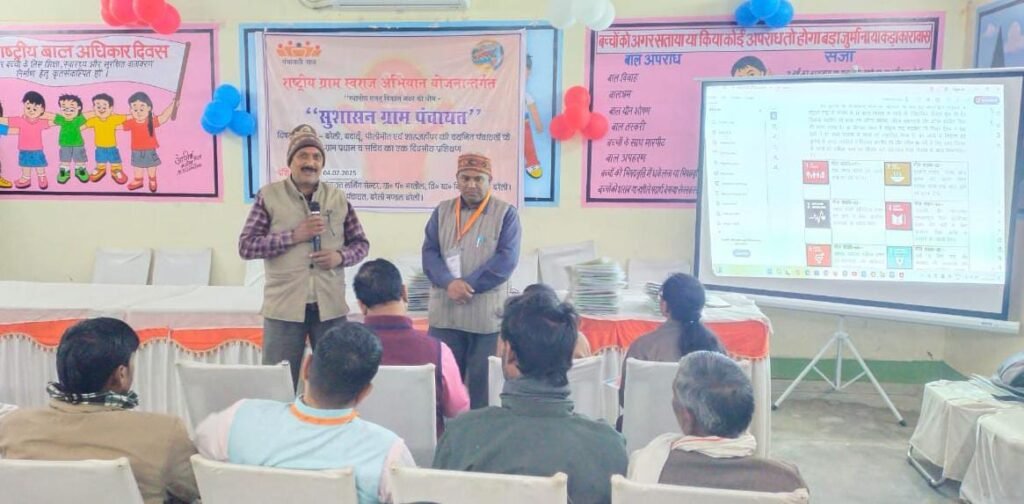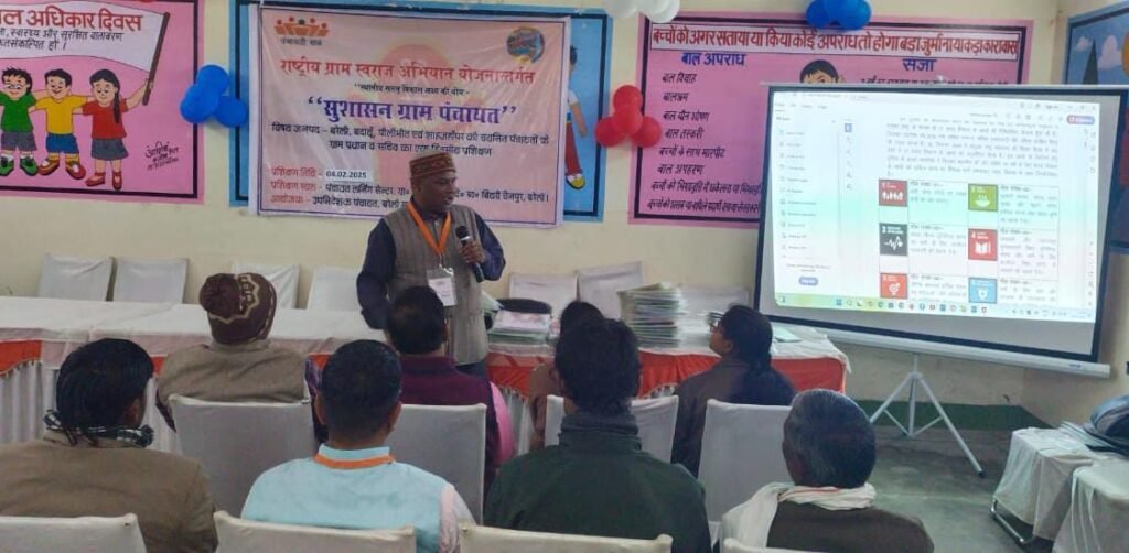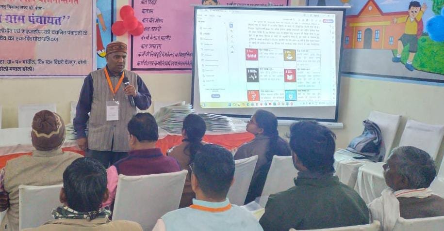 भरतौल (बरेली)। राष्ट्रीय ग्राम स्वराज अभियान योजना के अंतर्गत पंचायत लर्निंग सेंटर ग्राम पंचायत भरतौल में बरेली मंडल के पीलीभीत और शाहजहांपुर जनपद के ग्राम प्रधान और सचिव का एक दिवसीय प्रशिक्षण तृतीय एवं चतुर्थ बैच में स्थानीय सतत विकास लक्ष्य की नौ थीम पर उपनिदेशक पंचायत महेंद्र सिंह के दिशा निर्देशन में हुआ। राज्य प्रशिक्षक अमित कुमार सिंह तोमर ने प्रशिक्षण के उद्देश्य पर चर्चा करते हुए कहा कि सुशासन हेतु टीम वर्क, प्रौद्योगिकी, समयबद्धता, पारदर्शिता, परिवर्तन और रूपांतरण द्वारा गांव को सुशासन युक्त बनाना है।महिलाओं एवं बालिकाओं को लैंगिक समानता के साथ समान अवसर सहित सुरक्षित वातावरण प्रदान कराना होगा। उन्होंने सतत् विकास लक्ष्यों के 17 गोल पर चर्चा कर कम लागत बिना लागत के कार्यों पर प्रकाश डाला। चतुर्थ बैच में जनपद पीलीभीत और शाहजहांपुर की शेष ग्राम पंचायत के प्रधान और सचिव को प्रशिक्षण देते हुए राज्य प्रशिक्षक अमित कुमार सिंह तोमर ने थीम स्वच्छ एवं हरित गांव, आत्मनिर्भर बुनियादी ढांचे वाला गांव, सामाजिक रूप से न्याय संगत एवं सुरक्षित गांव, सुशासन वाला गांव सहित महिला हितेषी ग्राम पंचायत क्या, क्यों, कैसे पर ब्रेन स्टॉर्मिंगचर्चा और पीपीटी के माध्यम से समझाया। समान लैंगिक विकास पर चर्चा करते हुए राज्य प्रशिक्षक अमित कुमार सिंह तोमर ने स्थानीय लक्ष्य पर चर्चा की और कहा कि सामाजिक, राजनीतिक एवं आर्थिक गतिविधियों तथा समुदाय आधारित संगठनों में महिलाओं की प्रतिभागिता को बढ़ा कर महिलाओं को समान कार्य के लिए समान वेतन पर जोर दिया। उन्होंने मातृ मृत्यु दर में कमी लाने पर चर्चा की। बालिकाओं, गर्भवती महिलाओं तथा धात्री महिलाओं में खून की कमी पर भी चर्चा करते हुए आयुष्मान भारत, स्वास्थ्य बीमा, स्वास्थ्य योजना, प्रधानमंत्री मातृ वंदना योजना, महिला विकास संबंधी गतिविधियों पर चर्चा कर बजट पर भी चर्चा की। उक्त बिंदुओं पर पंचायत की भूमिका पर चर्चा करते हुए ग्राम सभा से पूर्व महिला सभा को सुनिश्चित करने, महिलाओं की भागीदारी को प्रोत्साहन देने, सुरक्षित वातावरण सुनिश्चित करने, बेहतरीन स्वास्थ्य देखभाल हेतु जागरूकता लाने, सभी विकास कार्यक्रमों में महिलाओं की भागीदारी सुनिश्चित करने पर जोर दिया। महिला और बाल विकास के लिए कार्य कर रही स्थाई समितियां को मजबूत बनाने, कम लागत बिना लागत की गतिविधियों पर जोर देते हुए गांव में समान लैंगिक विकास पर चर्चा की। ग्राम पंचायत हेतु उपयोगी संसाधन तथा सहयोगियों पर चर्चा करते हुए सामान लैंगिक विकास एवं ग्राम पंचायत विकास योजना पर प्रकाश डाला। मॉडल ग्राम पंचायत भरतौल का उदाहरण देते हुए भी समझाया गया। मंडलीय परियोजना प्रबंधक 