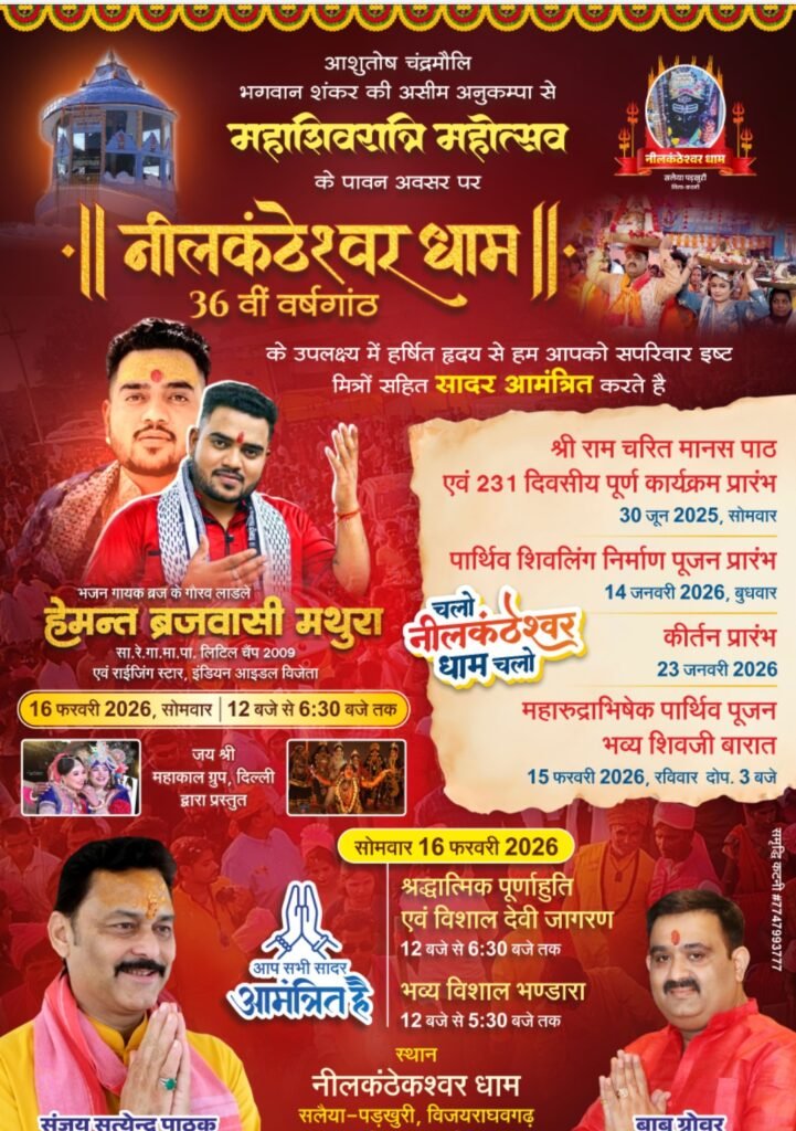 उनके लिए यह आयोजन केवल जिम्मेदारी नहीं यह पिता की साधना को जीवित रखने का संकल्प है।दिन-रात की सेवा श्रद्धालुओं की सुविधा संतों का सम्मान और हर आगंतुक के चेहरे पर संतोष यही उनकी साधना है।भक्तो का कहना हैं ग्रोवर परिवार ने मंदिर नहीं बनाया उन्होंने आस्था को आकार दिया है।इस पवित्र आयोजन को गरिमा और दिशा देने में अहम भूमिका निभा रहे हैं विजयराघवगढ़ विधायक संजय सत्येंद्र पाठक जिनका नाता इस धाम से केवल औपचारिक नहीं बल्कि आस्था और आत्मिक जुड़ाव का है।क्षेत्र के धार्मिक स्थलों के संरक्षण संस्कृति के संवर्धन और परंपरा के सम्मान के प्रति उनकी प्रतिबद्धता सर्वविदित है। श्रद्धालुओं का कहना है जब जनसेवक भी शिवभक्त हो तब आयोजन केवल कार्यक्रम नहीं पर्व बन जाता है। उनके मार्गदर्शन में निलकंठेश्वर धाम का यह आयोजन हर वर्ष और अधिक दिव्य और अधिक भव्य बनता जा रहा है *महाशिवरात्रि की रात्रिजब धरती पर उतरेगा कैलाश* महाशिवरात्रि के अवसर पर दो दिवसीय भव्य आयोजन में अखंड पाठ की पूर्णाहुति रुद्राभिषेक शिव महिमा गान भव्य झांकियां शिव बारात विशाल भंडारा आस्था के अनुपम दृश्य रचेंगे।इस बार भक्तिरस को और गहन बनाएंगे प्रसिद्ध भजन गायक हेमंत ब्रजवासी (मथुरा) जिनकी आवाज़ में जब शिव भजन गूंजेंगे तो आंखें नम और हृदय शिवमय हो उठेंगे। जहाँ एक ही परिसर में मिलते हैं 12 ज्योतिर्लिंगों के दर्शन निलकंठेश्वर धाम की विशेषता यह है कि यहां