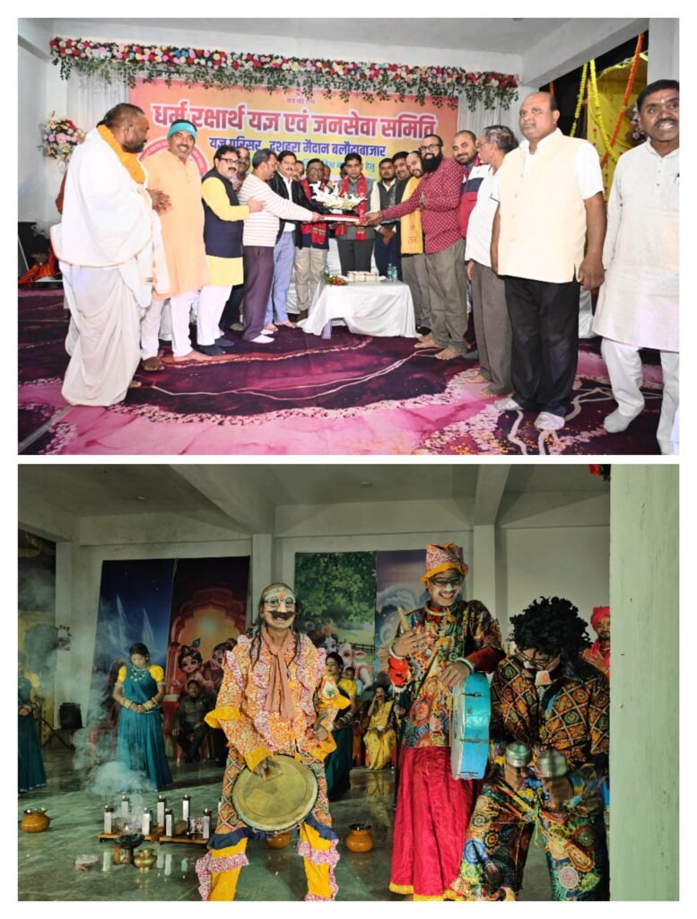 बलौदाबाजार: जिला मुख्यालय दशहरा मैदान में आयोजित ग्यारह दिवसीय श्री हनुमत महायज्ञ में प्रत्येक संध्याकाल धार्मिक और सांस्कृतिक कार्यक्रमों की श्रृंखला ने सैकड़ों दर्शकों को मंत्रमुग्ध कर दिया। यज्ञ स्थल पर श्रीलंकाई बाल कलाकारों का मनमोहक प्रदर्शन, स्थानीय भाटापारा के डॉ. ललित ठाकुर एवं सहयोगियों द्वारा प्रस्तुत छत्तीसगढ़ी वनवासी राम की संगीतमय मंचीय नाटकीय प्रस्तुति, दीपक केशरी और गोवर्धन शर्मा की भजन संध्या, और राजनांदगांव के प्रसिद्ध छत्तीसगढ़ी लोक गायक महादेव हिरवानी (साहू) एवं सहयोगियों के सांस्कृतिक कार्यक्रम दर्शकों को रात्रि तक यज्ञ स्थल पर बिठाए रखने के लिए पर्याप्त थे।