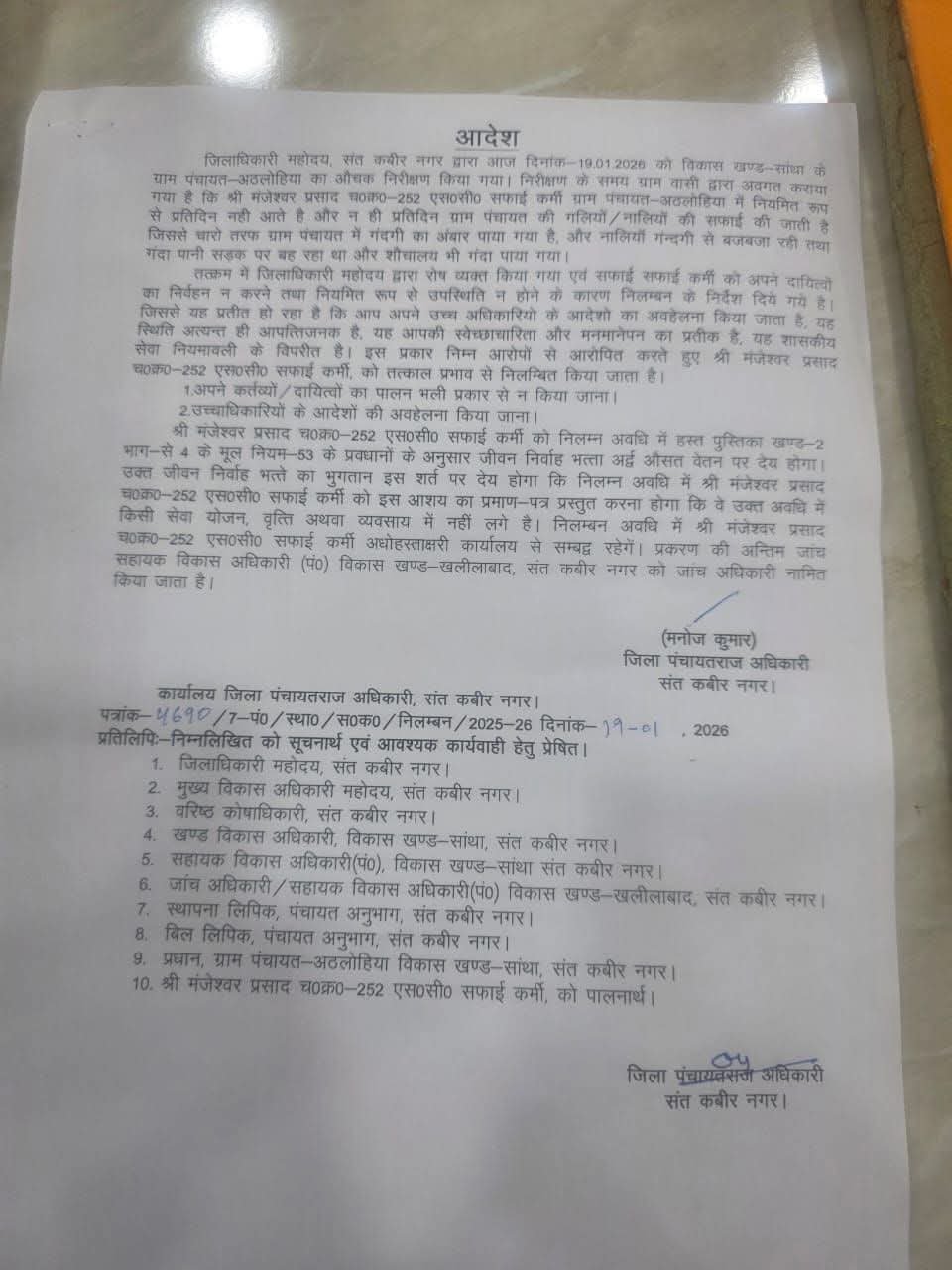 संत कबीर नगर।। सरकारी काम में कोताही और जनता की समस्याओं को नजरअंदाज करने वाले कर्मचारियों पर अब गाज गिरनी शुरू हो गई है। विकास खण्ड-सांथा के ग्राम पंचायत अठलोहिया में सफाई व्यवस्था की बदहाली देख जिलाधिकारी का पारा चढ़ गया, जिसका नतीजा एक कर्मचारी के निलंबन के रूप में सामने आया है।