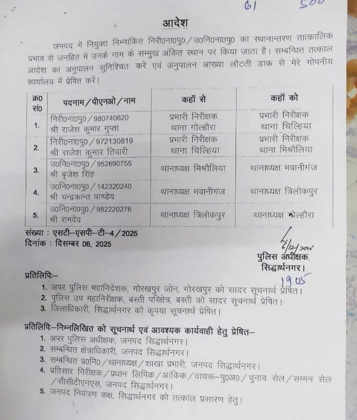 सिद्धार्थनगर में कानून-व्यवस्था को सुदृढ़ बनाने के उद्देश्य से पुलिस अधीक्षक डॉ. अभिषेक महाजन ने शनिवार देर शाम एक बड़ा प्रशासनिक फेरबदल किया। इस आदेश के तहत जिले के 5 थानों के थानाध्यक्षों को नई जिम्मेदारियां सौंपी गई हैं।