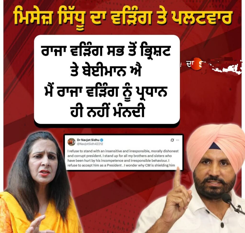 ਮਿਸੇਜ਼ ਸਿੱਧੂ ਦਾ ਵੜਿੰਗ ਤੇ ਪਲਟਵਾਰ, “ਰਾਜਾ ਵੜਿੰਗ ਸਭ ਤੋਂ ਭ੍ਰਿਸ਼ਟ ਤੇ ਬੇਈਮਾਨ ਐ”, “ਮੈਂ ਰਾਜਾ ਵੜਿੰਗ ਨੂੰ ਪ੍ਰਧਾਨ ਹੀ ਨਹੀਂ ਮੰਨਦੀ”