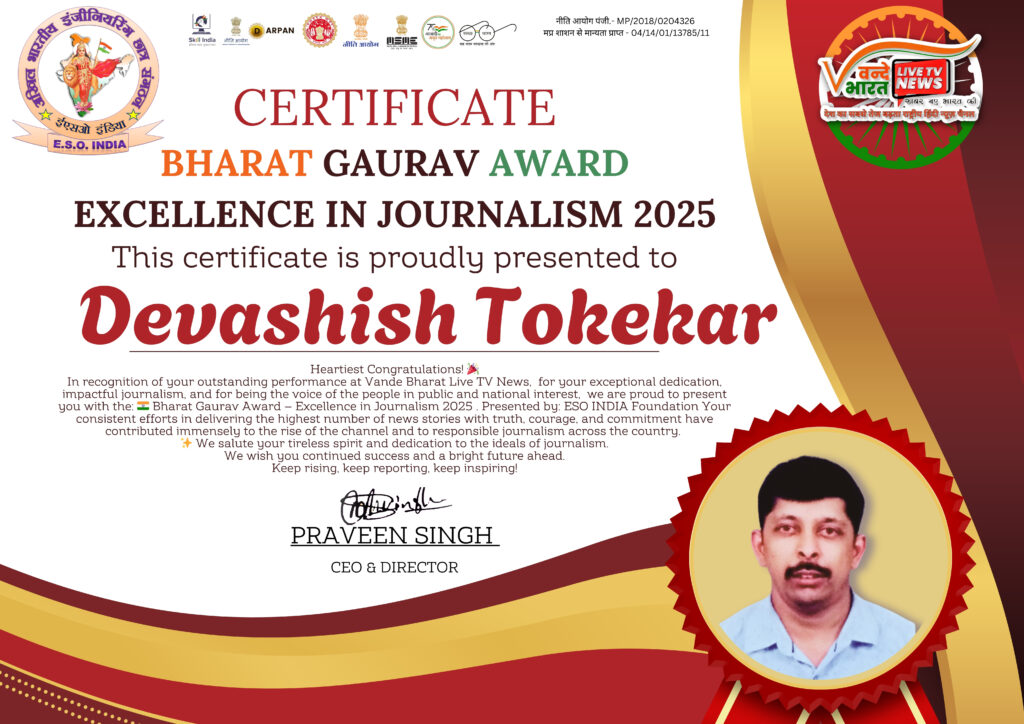рд╡рдВрджреЗ рднрд╛рд░рдд рд▓рд╛рдЗрд╡ рдЯреАрд╡реА рдиреНрдпреВрдЬрд╝ рдХреЗ рдорд╣рд╛рд░рд╛рд╖реНрдЯреНрд░ рд╕реЗ рдЬреБрдбрд╝реЗ рд╕рдХреНрд░рд┐рдп рдПрд╡рдВ рд╕рдорд░реНрдкрд┐рдд рдкрддреНрд░рдХрд╛рд░ рд╢реНрд░реА рдпреЛрдЧреЗрд╢ рдЯреЛрдХреЗрдВрдХрд░ рдХреЛ ESO INDIA Foundation рджреНрд╡рд╛рд░рд╛ “рднрд╛рд░рдд рдЧреМрд░рд╡ рд╕рдореНрдорд╛рди тАУ рдЙрддреНрдХреГрд╖реНрдЯ рдкрддреНрд░рдХрд╛рд░рд┐рддрд╛ рд╕рдореНрдорд╛рди 2025” рд╕реЗ рд╕рдореНрдорд╛рдирд┐рдд рдХрд┐рдпрд╛ рдЧрдпрд╛ред