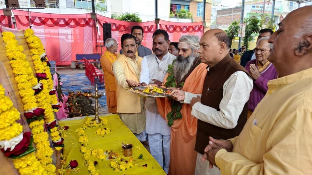 सागर/वंदे भारत लाइव टीवी न्यूज रिपोर्टर सुशील द्विवेदी 8225072664 * वेदमाता माता गायत्री एवं पूज्य गुरू सत्ता के सूक्ष्म संरक्षण में 18 दिसंबर से 21 दिसंबर तक आयोजित होने वाले 9 कुण्डीय गायत्री महायज्ञ का रविवार को गायत्री प्रज्ञा मंडल मकरोनिया के तत्वाधान में कबीर वाटिका,राम दरबार के पीछे, मकरोनिया में वैद मंत्रों की अनुगुंजन में भूमिपूजन संस्कार आयोजित किया गया। इस आध्यात्मिक आयोजन में नरयावली विधायक इंजी.प्रदीप लारिया शामिल हुए। यह महायज्ञ जन–जन में जागृति, संस्कार, सत्कार्य और सामाजिक समरसता की राह दिखाने वाला विराट आध्यात्मिक अभियान है। 9 कुण्डीय महायज्ञ से क्षेत्र में शांति, समृद्धि, आध्यात्मिक ऊर्जा एवं कल्याण का संदेश दूर–दूर तक प्रसारित होगा। चार दिवसीय आध्यात्मिक आयोजन में 18 दिसंबर को दोपहर 2:00 बजे से कलश यात्रा, सांय कालीन आरती, प्रसादी वितरण, 19 दिसंबर को देव पूजन, गायत्री महायज्ञ, पवन प्रज्ञा पुराण कथा एवं युग निर्माण, 20 दिसंबर को गायत्री महायज्ञ, दीक्षा संस्कार अन्य सभी संस्कार, युवा चेतना शिविर, पावन प्रज्ञा पुराण कथा, 2400 दीपकों द्वारा दीप यज्ञ एवं 21 दिसंबर को गायत्री महायज्ञ, पूर्णाहुति, टोली विदाई और महाप्रसादी वितरण का आयोजन होगा। आयोजन समिति में सभी सदस्यों व गायत्री परिवार के परिजनों से आध्यात्मिक आयोजन में उपस्थित होने का अनुरोध किया है। इस अवसर पर महंत पं.श्री केशव गिरी महाराज,नपाध्यक्ष मिहीलाल,डॉ.अनिल तिवारी, पार्षद बलवंत ठाकुर, विवेक सक्सेना, राजा रिछारिया, जितेंद्र खटीक, मुकेश पटेल, कपिल कुशवाहा, दिलीप कटारे,गंगा प्रसाद सक्सेना, एमडी त्रिपाठी, केदार शर्मा, बाबूलाल रोहित सहित आयोजन समिति सदस्य व गायत्री परिवार के सदस्यगण प्रमुख रूप से उपस्थित थे।