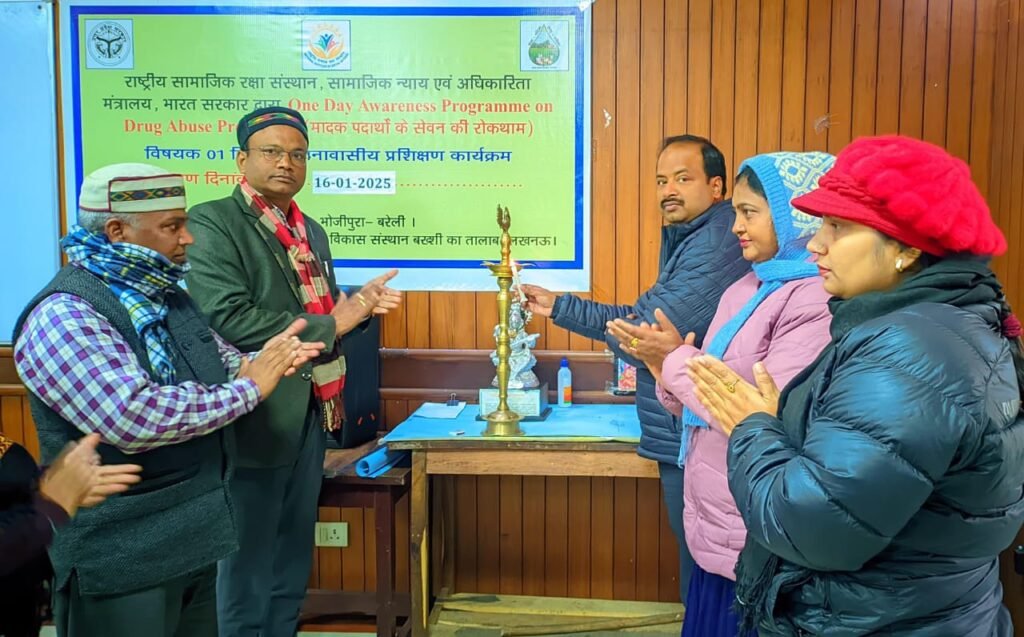 mभोजीपुरा (बरेली)। राष्ट्रीय सामाजिक रक्षा संस्थान, सामाजिक न्याय एवं अधिकारिता मंत्रालय भारत सरकार द्वारा मादक पदार्थों के सेवन की रोकथाम पर एक दिवसीय प्रशिक्षण कार्यक्रम जिला ग्राम्य विकास संस्थान भोजीपुरा में जिला प्रशिक्षण अधिकारी एवं खंड विकास अधिकारी कमल किशोर श्रीवास्तव ने दीप जलाकर शुभारंभ किया।
