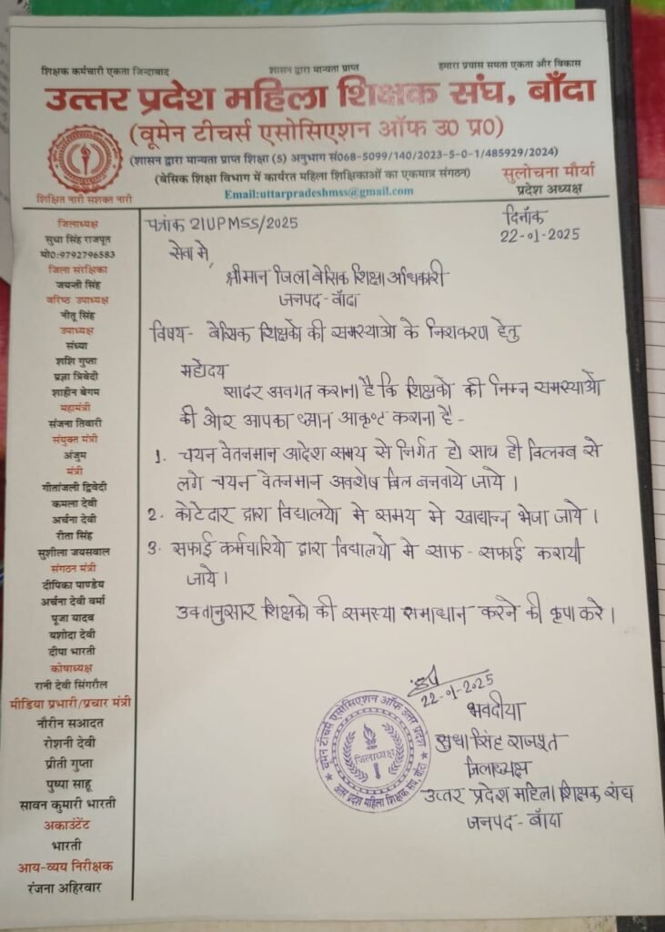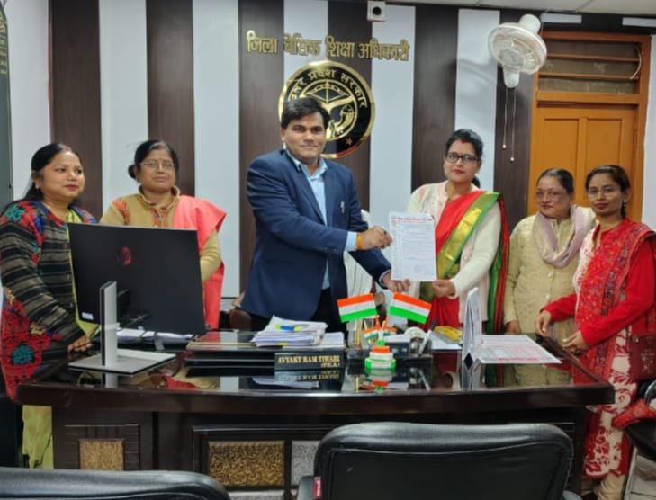 उत्तर प्रदेश महिला शिक्षक संघ बांदा की जिलाध्यक्ष सुधा सिंह राजपूत ने अपनी कार्यकारिणी के साथ जिला बेसिक शिक्षा अधिकारी से मुलाकात कर नए वर्ष की शुभकामनाएं दी और बेसिक शिक्षकों की समस्याओं से संबंधित ज्ञापन सौंपा जिला बेसिक शिक्षा अधिकारी महोदय ने समस्याओं को सुना और जल्दी ही निस्तारण करने का आश्वासन दिया। ज्ञापन देने में जिला अध्यक्ष सुधा सिंह राजपूत जिला संरक्षिका जयंती सिंह वरिष्ठ उपाध्यक्ष नीतू सिंह संगठन मंत्री दीपिका पांडे मीडिया प्रभारी चित्रा , महामंत्री संजना, मीडिया प्रभारी नौरीन सआदत, उपाध्यक्ष शाहीन बेगम ,शशि गुप्ता, संध्या, पूजा यादव अर्चना देवी दीपा भारती ,रोशनी देवी,पुष्पा, साहू रंजना अहिरवार ,भारती आदि उपस्थित रही।