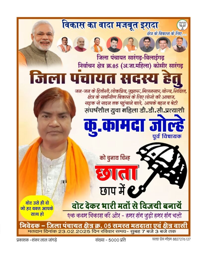 चुनाव चिन्ह मिलने के पश्चात् पूर्व विधायक सुश्री कामदा जोल्हे ने माँ कौशलेशवरी के दरबार में नत मस्तक होकर आशीर्वाद लिया!और जनता का अपार समर्थन प्राप्त हुआ तथा इस अवसर पर बड़े -बुजुर्गो का आशीर्वाद लिया! जनता की सदा हितेषी और सुख दुःख में शामिल होने वाली सजक महिला के रूप में इनकी व्याख्याता है! शुश्री कामदा जोल्हे ने कहा की वह जनता समर्पित महिला है! जो सदा जनता की लड़ाई में शामिल थी और रहेगी.