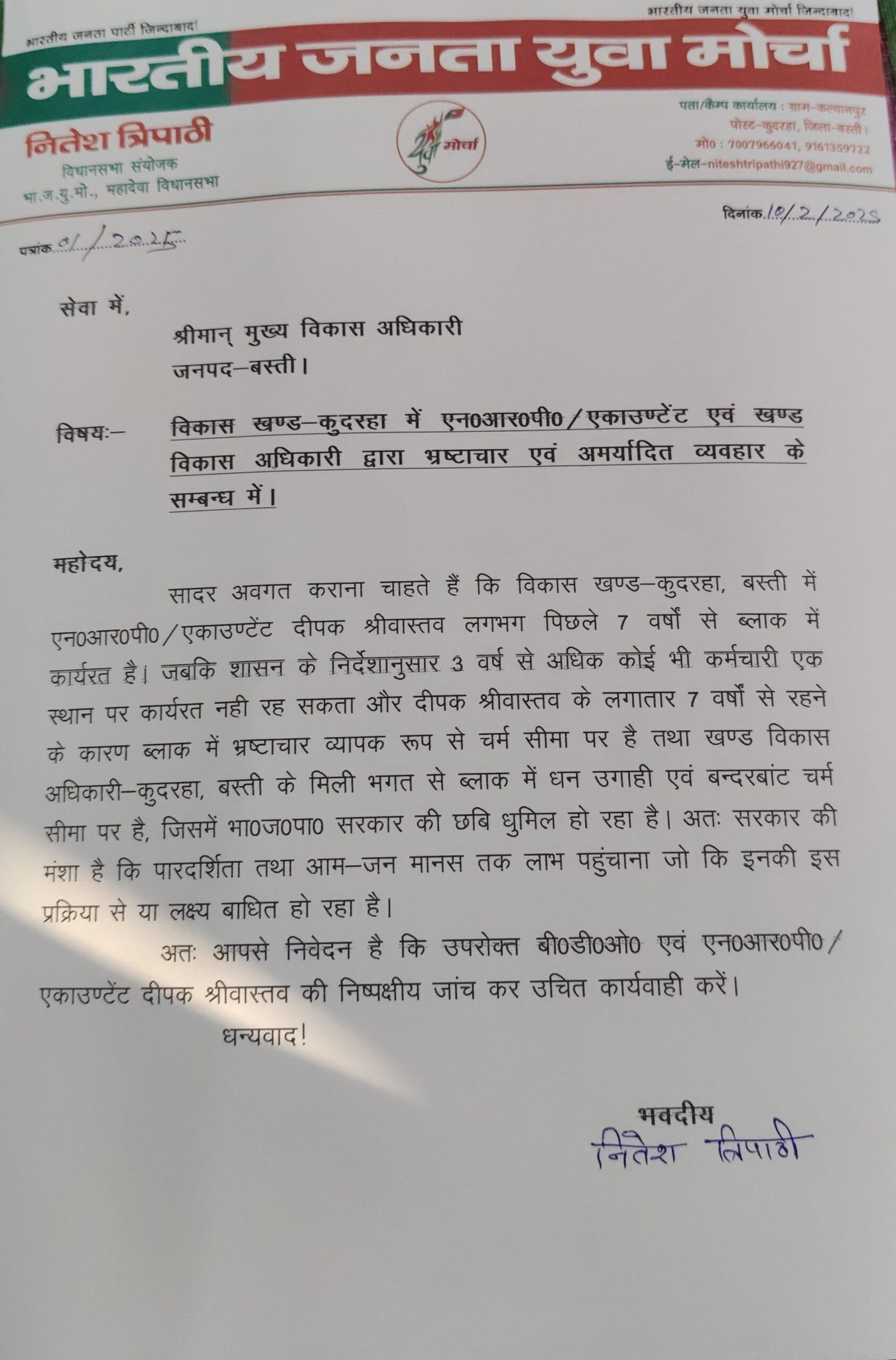 भा.ज.युवा मोर्चा के नेता नितेश त्रिपाठी ने मुख्य विकास अधिकारी को पत्र लिखकर निष्पक्ष जाँच की माँग।
