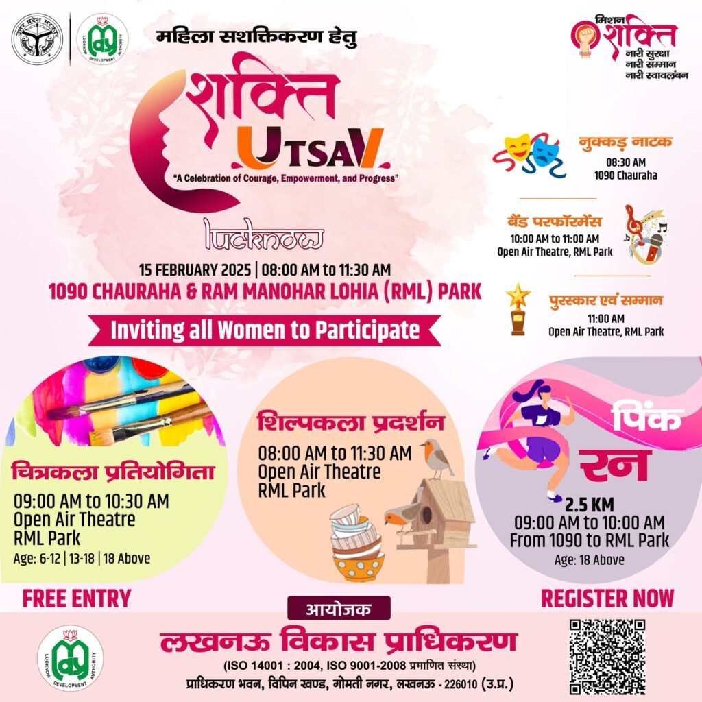 लखनऊ विकास प्राधिकरण आगामी 15 फरवरी को ‘शक्ति उत्सव’ का आयोजन करने जा रहा है। मिशन शक्ति के अंतर्गत आयोजित किये जा रहे इस कार्यक्रम में 1090 चौराहे से लेकर डाॅ0 राम मनोहर लोहिया पार्क तक पिंक रन होगी। साथ ही नुक्कड़ नाटक, महिला बैंड फरफाॅरमेंस, शिल्पकला प्रदशर्नी व चित्रकला प्रतियोगिता कार्यक्रम में रोमांच भरेंगे।