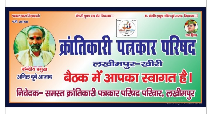 लखीमपुर खीरी। क्रांतिकारी पत्रकार परिषद केंद्रीय प्रमुख/ राष्ट्रीय अध्यक्ष माननीय अनिल दूबे आजाद जी के निर्देशानुसार जनपद लखीमपुर खीरी में मुख्यालय पर होने वाली प्रथम बैठक महेवागंज कस्बे के दुबग्गा बाजार रोड स्थित पंचायत भवन में समय दिन में 11:00 होना सुनिश्चित की गई है। यह बैठक जनपद लखीमपुर खीरी के जिला अध्यक्ष, जिला सचिव एवं जिला प्रभारी के पद के प्रस्ताव प्रेषित करने के लिए आयोजित की जा रही है। बैठक में प्रभारी के रूप में जिला बहराइच के संजय शुक्ल जी, एवं लखनऊ टीम से मृत्युंजय चौधरी विशेष रूप से मौजूद रहेंगे । और प्रस्ताव बनाकर केंद्रीय कमेटी को प्रेषित करेंगे जिला कार्यकारिणी के लिए पदाधिकारी के चयन की प्रक्रिया पर भी विचार विमर्श किया जाएगा बैठक की अध्यक्षता अमर उजाला के वरिष्ठ पत्रकार अखिलेश रस्तोगी जी करेंगे। यह जानकारी जिला सदस्यता प्रभारी मो इरफान अंसारी एवं सदस्यता प्रभारी अंशु वर्मा ने दी।