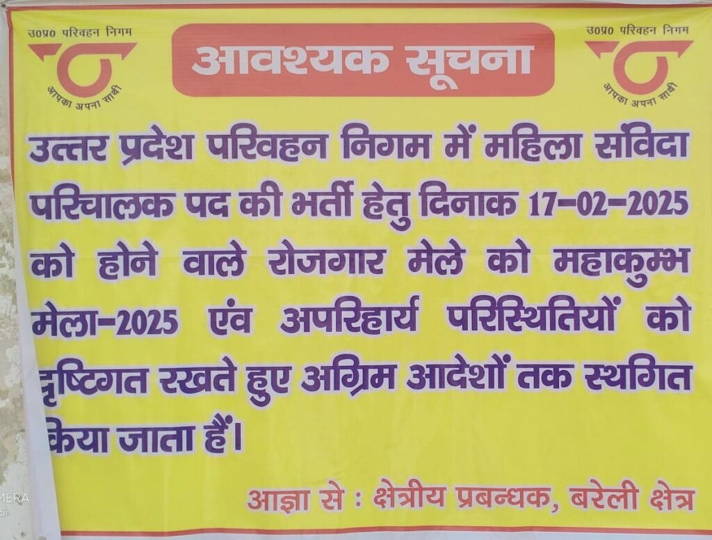 इस भर्ती मेले के माध्यम से उत्तर प्रदेश परिवहन निगम में महिला संविदा परिचालकों की नियुक्ति की जानी थी, जिससे महिलाओं को रोजगार के नए अवसर मिलते। लेकिन महाकुंभ मेले की व्यवस्थाओं और अन्य प्रशासनिक कारणों से इसे स्थगित करना पड़ा है।