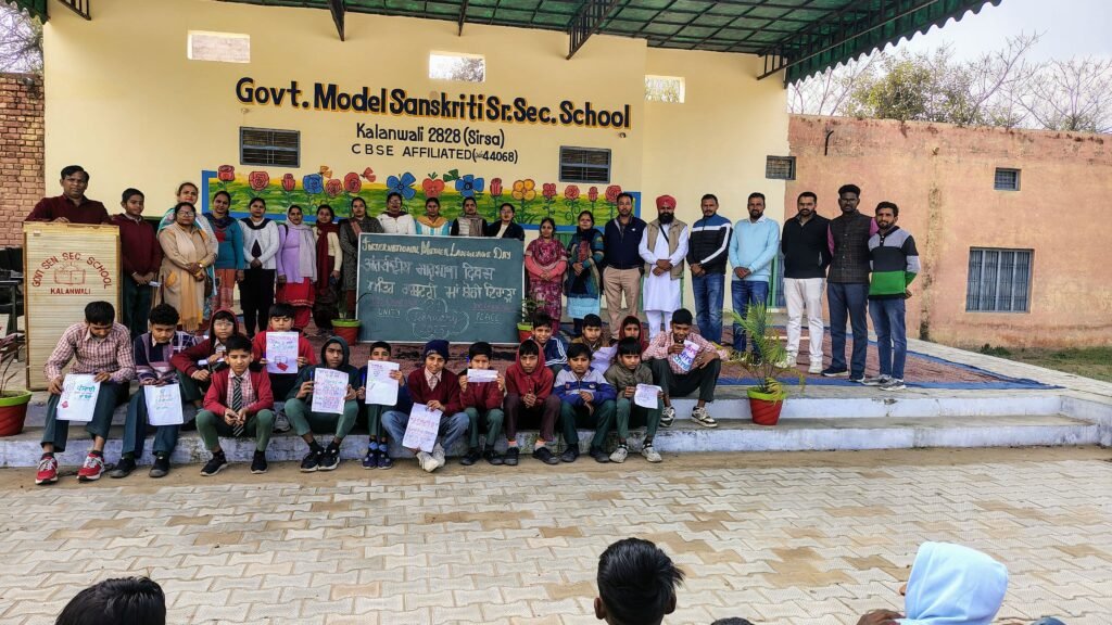 राजकीय मॉडल संस्कृति वरिष्ठ माध्यमिक विद्यालय कालांवाली में ‘सिल्वर जुबली समारोह’ थीम आधारित अंतर्राष्ट्रीय मातृभाषा दिवस का आयोजन किया गया| हिंदी प्राध्यापक मनोहर खनगवाल ने इस दिवस को मनाने के इतिहास के बारे में विद्यार्थियों को सम्बोधित करते हुए बताया कि भाषा के महत्व को बढ़ाते हुए यूनेस्को ने 1999 में 21 फरवरी को अंतर्राष्ट्रीय भाषा दिवस के रूप में मनाने की घोषणा की थी|यूनेस्को के अनुसार विश्वभर में 8324 भाषाएं है जिनमे से 7000भाषाएँ आज भी प्रचलन में है| इस वर्ष मातृभाषा दिवस की 25वीं वर्षगांठ है| पंजाबी प्राध्यापिका रेनू बाला ने मातृभाषा के महत्व के बारे में बताया कि राष्ट्रीयता से जोड़ती है और देश प्रेम की भावना पैदा करती है| मातृभाषा ही हमें हमारे हमारे देश की संस्कृति इतिहास सामाजिक परम्पराओं से जोड़ने की क्षमता रखती है| अंग्रेजी अध्यापिका खुशबू ने अंग्रेजी भाषा को सरलता से सीखने और उच्चारण करने के लिए कुछ टिप्स दिए तथा विद्यार्थियों को अंग्रेजी भाषा बोलने के लिए प्रेरित किया| इस दिवस पर छात्रों ने पोस्टर मेकिंग,निबंध प्रतियोगिता, भाषण, कविता उच्चारण,विभिन्न गतिविधियों में बढ़-चढ़कर भाग लिया| छात्र पंकज ने मंच संचालन किया| छात्र प्रदीप,सुमित,संदीप, शिव,मनीष ने प्रतियोगिता में बेहतरीन प्रदर्शन किया| इस कार्यक्रम को सफल बनाने में भाषा शिक्षक गुरदीप सिंह,जगसीर सिंह, शिक्षिका शारदा,सुमन रानी मंजू, सुनीता का विशेष योगदान रहा|प्राचार्य जगदेव सिंह गिल ने सभी विद्यार्थियों को बधाई और इस अवसर पर विद्यार्थियों को सम्मानित भी किया गया|