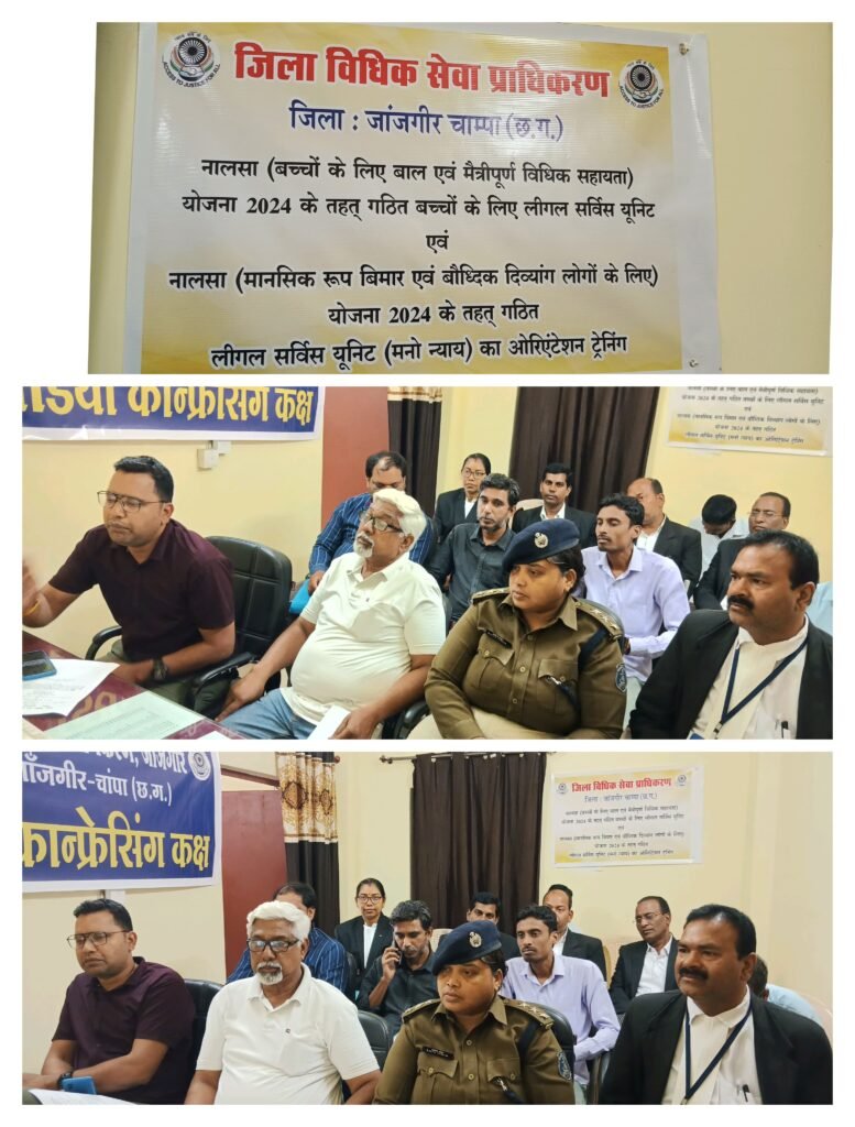 सक्ति समाचार- आज दिनांक 21/02/2025 को एक दिवसीय नालसा (बच्चों के लिए बाल एवं मैत्रीपूर्ण विधिक सहायता) योजना 2024 के तहत गठित बच्चों के लिए लीगल सर्विस यूनिट एवं नालसा (मानसिक रूप से बीमा एवं बौद्धिक दिव्यांग लोगों के लिए) योजना 2024 के तहत गठित लीगल सर्विस यूनिट का ओरिएंटेशन ट्रेनिंग न्याय सदन जिला विधिक सेवा प्राधिकरण जांजगीर में आयोजित किया गया जिसमें उक्त दोनों लीगल सर्विस यूनिट के सदस्यों एवं प्रतिभागी ऑफलाइन एवं वीडियो कॉन्फ्रेंसिंग के माध्यम से जुड़े जिसमें सर्वप्रथम श्री गजेंद्र सिंह जायसवाल जिला एवं बाल संरक्षण अधिकारी जांजगीर द्वारा नालसा बच्चों के लिए बाल एवं महत्वपूर्ण विधिक सहायता योजना 2024 के संबंध में विस्तृत रूप से जानकारी देते हुए बच्चों के संबंध में समस्त योजनाएं, स्पॉन्सरशिप योजना, बच्चों के प्रति ध्यान देने वाली बटन एवं अन्य बच्चों से संबंधित कानून की जानकारी दिया गया। डॉक्टर इकबाल द्वारा उपस्थित लोगों को मानसिक रूप से बीमार एवं बौद्धिक दिव्यांग लोगों के लिए योजना 2024 के संबंध में विस्तृत रूप से जानकारी देते हुए मानसिक रूप से बीमार व्यक्तियों के संबंध में योजनाओं एवं उनके लिए की जिला अस्पताल एवं अन्य जगह पर जो विशेष व्यवस्था बनाया गया है उसके संबंध में विस्तृत जानकारी व कानूनी प्रावधान का जानकारी दिया गया। श्रीमती कविता ठाकुर अतिरिक्त पुलिस अधीक्षक जांजगीर द्वारा बच्चों के अपराधों के संबंध में शुरुआती जांच के प्रावधानों एवं जांच में दी जाने वाली विशेष बातों के संबंध में वह प्रावधानों के संबंध में विस्तृत जानकारी दिया गया। श्रीमती उषा शांडिल्य पैनल अधिवक्ता एवं सदस्य द्वारा उपस्थित लोगों को लैंगिक अपराधों से बालकों का संरक्षण अधिनियम एवं किशोर न्याय अधिनियम के संबंध में विस्तृत रूप से जानकारी दिया गया साथ ही बच्चों के मामले के संबंध में जांच एवं सुनवाई के दौरान ध्यान देने वाली आवश्यक बातें एवं दस्तावेज के संबंध में जानकारियां दी गई। श्री गणेश प्रसाद शर्मा अध्यक्ष बाल कल्याण समिति जांजगीर द्वारा उपस्थित लोगों को नल सब बच्चों के लिए बाल एवं मैत्रीपूर्ण विधिक सहायता योजना 2024 एवं नालसा मानसिक रूप से बीमा एवं भौतिक दिव्यांग लोगों के लिए योजना 2024 दोनों विषयों पर विस्तृत रूप से जानकारी देते हुए लोगों को अधिक से अधिक इन योजनाओं के बारे में जानकारी देने एवं लोगों की सहायता करने के संबंध में जानकारी दिया गया। इस कार्यक्रम में श्री लीलेश्वर रत्नाकर डिप्टी चीफ लीगल एड डिफेंस काउंसिल जांजगीर, श्री बी.एम. बेक उपसंचालक समाज कल्याण विभाग जांजगीर, सर्विस यूनिट के समस्त सदस्य पैनल अधिवक्ता, डॉ अमित मिरी एवं सभी सदस्य पैरा लीगल वालंटियर जिला विधिक सेवा प्र