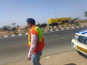 पाली: शासन की सर्वोच्च प्राथमिकता सड़क सुरक्षा जीवन रक्षा के तहत् राष्ट्रीय राजमार्ग खंड पाली के अधिशाषी अभियन्ता राहुल पवार जोधपुर पाली हाईवे के प्रोजेक्ट मैनेजर मुथू कुमार, के श्रीकांत के संयुक्त तत्वावधान में आज शुक्रवार को हाईवे प्रबंधन की टीम के साथ खारडा गाजनगढ़ रामटीला घूमटी हाईवे पर घूम रहे निराश्रित गौवंशो को रेस्क्यू कर सुरक्षित गौशाला भेजा गया, इस मौके पर जोधपुर पाली हाइवे के सीएसआर मैनेजर फिरोज़ ख़ान ने गौ पालकों से निवेदन किया की अपने गौवंशों को हाईवे पर खुला न छोड़े जिससे बेजुबान पशुओं की दुर्घटना होने की संभावना बढ़ जाती है साथ ही रोड यूजर्स भी दुर्घटना के शिकार हो जाते है, मेंटेनेंस मैनेजर मनीष सिंह ने बताया की हाईवे पर घूम रहे बेसहारा गोवंशों से रात्रि कालीन में होने वाली दुर्घटनाओं को कम करने के लिये लगातार पेट्रोलिंग टीम के द्वारा सतत निगरानी की जा रही है जिससे हाईवे पे होनी वाली आकस्मिक दुर्घटनाओं की रोकथाम की जा सके। आप सभी वाहन चालकों से निवेदन है कि हाईवे पर सड़कों पर अपनी सुरक्षा के साथ बेसहारा गौवंशों की सुरक्षा का ध्यान अवश्य रखें, साथ ही घूम रहे गौवंशों को हाईवे के किनारे पाली जिले की संचालित गौशाला में भी पंहुचाया गया है जिससे वाहन चालक सुरक्षित यात्रा कर सकेंगे.इस मौके पर हाईवे अधिकारियों के साथ टोल स्टॉफ उपस्थित रहे