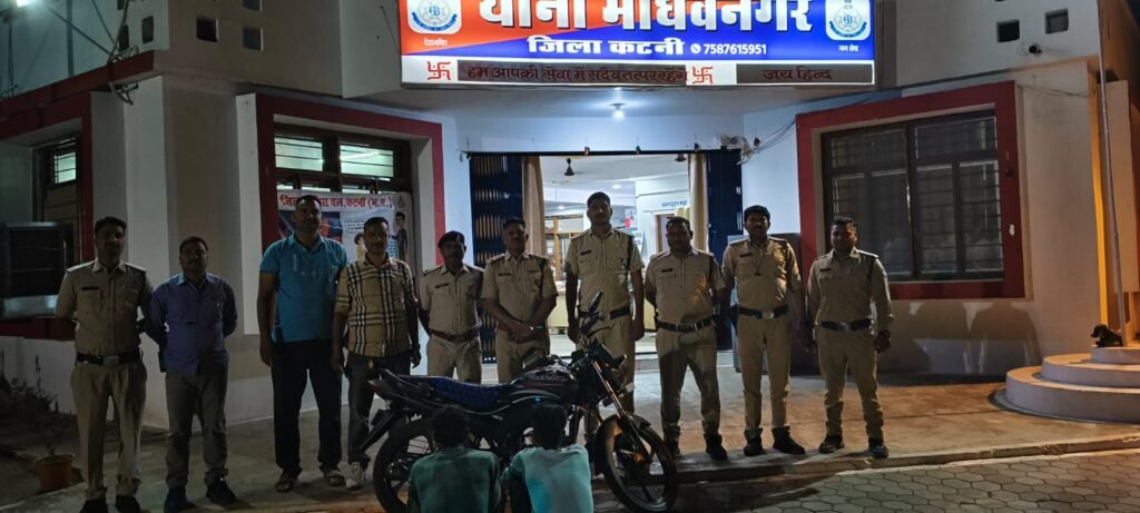 माधवनगर पुलिस ने माधवनगर क्षेत्र में हुई एक मोटर सायकल के चोरी के मामले में तहकीकात करते हुए 02 चोरो को जिला उमरिया से पकड़ने में सफलता हासिल की है। पकड़े गए चोर कटनी जिले मे माधवनगर के कैम्प में मजदूरी का काम करने आये थे और कुछ दिन काम करने के बाद दिनांक 11/04/25 के रात 10 बजे चोरी की घटना को अंजाम देते हुए शनि चौक माधवनगर से एक हीरो कंपनी की पेशन प्रो मोटर सायकल चुरा ले गये। पकड़े गए चोरों के पास से एक पेशन प्रो मोटर सायकल कीमती 50 हजार रूपये की बरामद की गई है।