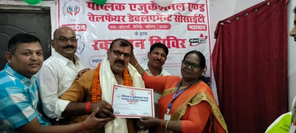 रक्तदान करने से कोई विशेष कमजोरी नहीं होती। बल्कि 24 से 48 घंटे में पौष्टिक आहार लेने पर उतना खून शरीर में बन जाता है। उन्होंने रक्तदान करने वाले लोगों का हौसला बढ़ाया। बताते चलें कि रक्तदान कार्यक्रम में बलिया जनपद के जलालपुर निवासी विशाल विक्रम सिंह एवं अमरेश बहादुर सिंह दोनों भाइयों ने अपनी माता श्रीमती सुनैना देवी के चौथी पुण्यतिथि पर रक्तदान किया। कार्यक्रम के आयोजक पब्लिक एजुकेशनल एंड वेलफेयर डेवलपमेंट सोसाइटी के प्रबंधक नित्यानंद सिंह एवं उनकी टीम द्वारा कार्यक्रम का आयोजन किया गया। जहां रक्तदान करने वाले व्यक्तियों अतिथियों, एवं पत्रकारों को अंग वस्त्र से सम्मानित किया।