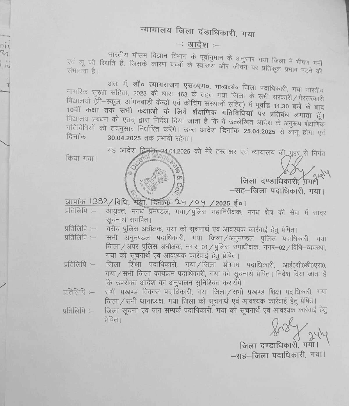 गया, 24 अप्रैल 2025, गर्मी को देखते हुए जिला दंडाधिकारी गया डॉ० त्यागराजन एसएम ने ज़िले के सभी सरकारी एव निजी विद्यालयों के कक्षा 10 तक / प्री स्कूल/ आंगनवाड़ी केंद्रों/ सभी कोचिंग संचालकों में पठन पाठन कार्य को सुबह 11:30 बजे तक ही संचालन करवाने का आदेश दिया है।