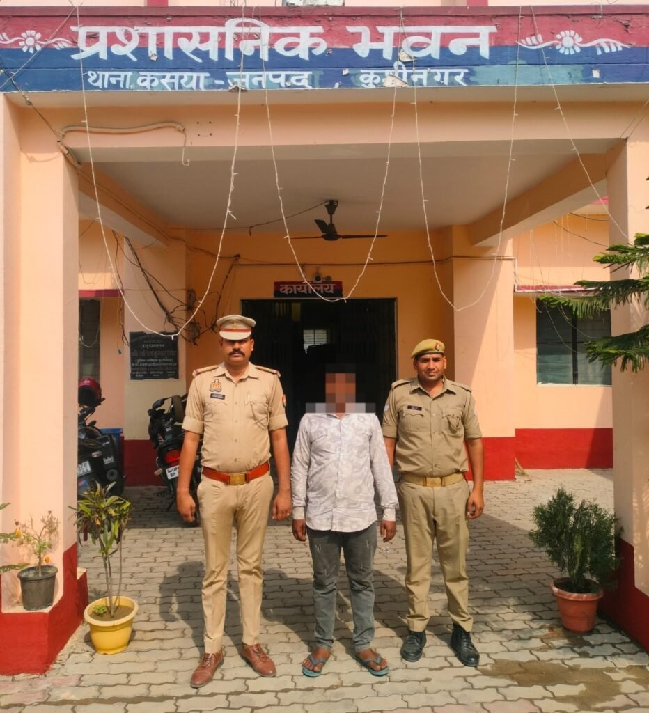 जनपद कुशीनगर में वाछिंत /वारंटी अभियुक्तों की गिरफ्तारी हेतु चलाये जा रहे अभियान के क्रम में आज दिनांक 26.04.2025 को थाना कसया पुलिस द्वारा थाना स्थानीय पर पंजीकृत मु0अ0सं0 0647/2024 धारा- 115(2)/352/351(3)/333/110/192(2)/118(2) बीएनएस से सम्बन्धित वांछित अभियुक्त कृष्णा सिंह पुत्र स्व0 ब्रह्मदेव सिंह निवासी सिरसिया खोहिया थाना कसया जनपद कुशीनगर को गिरफ्तार कर अग्रिम आवश्यक विधिक कार्यवाही की जा रही है ।