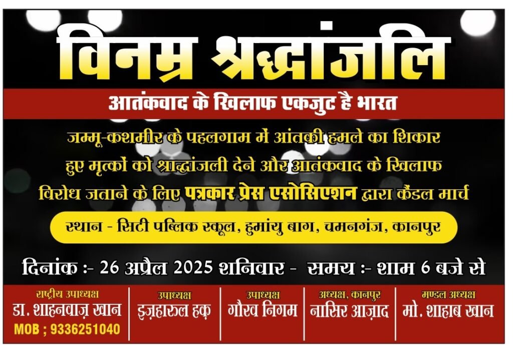 कानपुर कश्मीर के पहलगाम में हुए कायराना आतंकी हमले में निहत्थे मासूमों की शहादत से सम्पूर्ण देश शोकाकुल है। यह हमला न केवल निर्दोष जानों की हत्या है, बल्कि पूरी इंसानियत पर किया गया क्रूरतम प्रहार है। इस भीषण त्रासदी के विरोध में पत्रकार प्रेस एसोसिएशन ने सिटी पब्लिक स्कूल हुमायूँ बाग चमनगंज से कैंडल मार्च निकालकर हलीम कॉलेज चौराहे तक पहुंच कर श्रद्धांजलि शोक सभा का आयोजन किया गया।