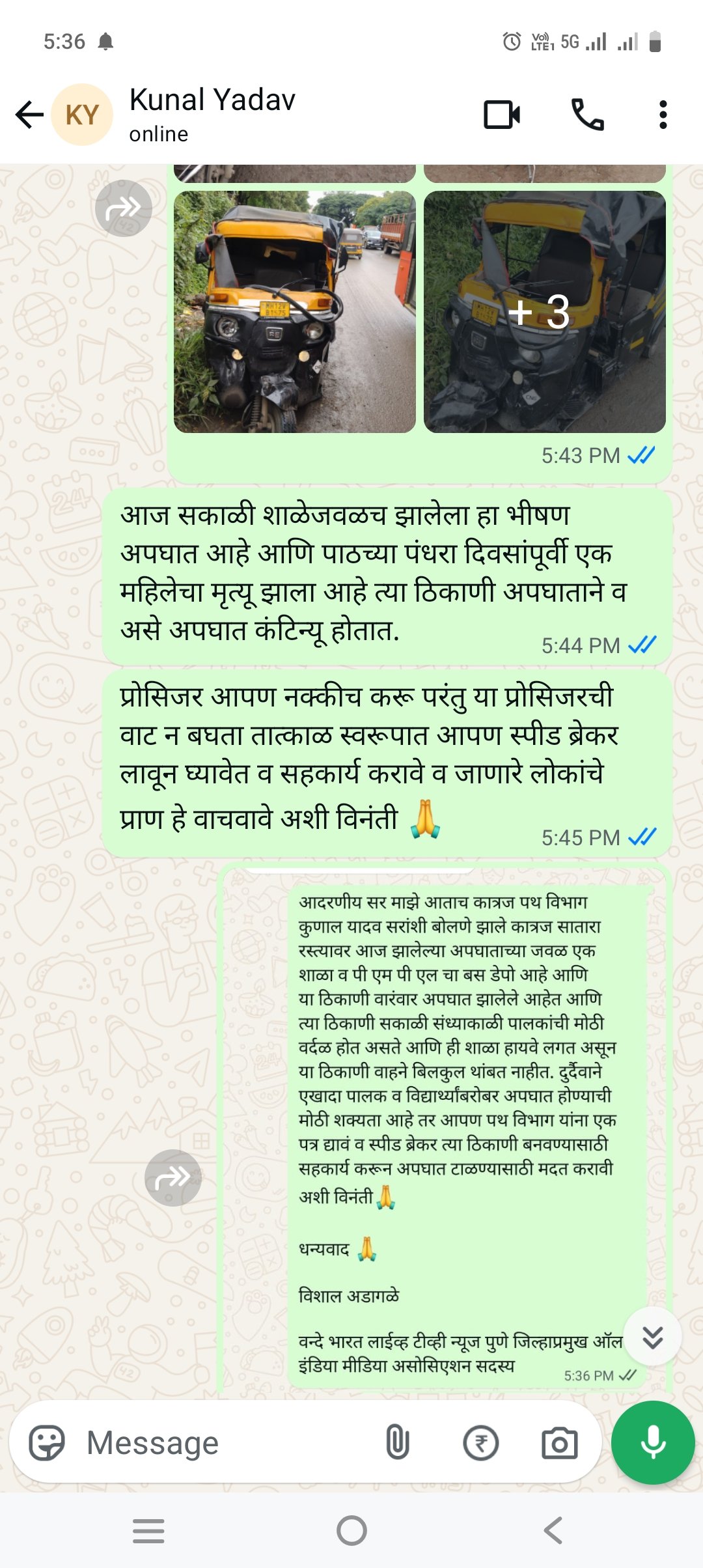याच कात्रज सातारा हायवेलगत गुजरवाडी फाटा येथे जवळच असलेले संत तुकाराम इंग्लिश मीडियम स्कूलकडून शाळेसमोर दोन्ही बाजूस गतिरोधक बनवण्यासाठी पुणे महानगरपालिकेला वारंवार पत्र व्यवहार करून देखील दखल घेतली जात नव्हती व हे काम प्रलंबित होते. शाळेसमोरून हलक्या व अवजड वाहनाची आवक जावक मोठ्या प्रमाणात वेगाने असून अनेक अपघातही झालेले होते. विद्यार्थी व पालकांना बरोबर मोठा अपघात होण्याची शक्यता होती. विद्यार्थी, पालक, शिक्षक, कर्मचारी, तसेच स्कूल व्हॅन यांना वेगाने आवक जावक करणाऱ्या वाहनांमधून धोकादायक पद्धतीने रस्ता ओलांडावा लागत होता. या वाहनांच्या वेग-मर्यादेला नियंत्रण आणण्यासाठी या ठिकाणी शाळेच्या दोन्ही बाजूला रंबल स्ट्रीप्स (वेग नियंत्रण पांढऱ्या पट्ट्या) आज बनवण्यात आल्या. यामध्ये प्रामुख्याने पुणे महानगरपालिका पथ विभाग शाखा अभियंता श्री. कुणाल यादव, पुणे ट्राफिक पोलीस डी.वाय.एस.पी श्री. हिम्मत जाधव, भारती विद्यापीठ ट्राफिक पी.आय श्री राजकुमार बरडे यांचे विशेष सहकार्याने गेली काही महिन्यांचे प्रलंबित काम काही दिवसातच पूर्ण करण्यात आले असून वन्दे भारत लाईव्ह टीव्ही न्यूज पुणे जिल्हा प्र. विशाल अडागळे यांच्यावतीने आभार व्यक्त करण्यात आले.