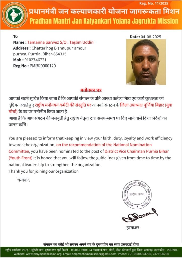 बिहार पूर्णिया: प्रधानमंत्री जन कल्याणकारी जागरूकता मिशन की युवा मोर्चा इकाई द्वारा संगठन विस्तार की प्रक्रिया के तहत तमन्ना परवेज को पूर्णिया जिला उपाध्यक्ष (युवा मोर्चा) मनोनीत किया गया है। यह नियुक्ति मिशन के प्रदेश अध्यक्ष एवं जिला अध्यक्ष की संयुक्त संस्तुति के आधार पर की गई है।युवा नेतृत्व को नई जिम्मेदारी, संगठन में नई ऊर्जा तमन्ना परवेज की नियुक्ति से संगठन में जोश और ऊर्जा का संचार हुआ है। युवा मोर्चा से जुड़े कार्यकर्ताओं ने इस निर्णय का स्वागत करते हुए कहा कि यह कदम संगठन को ज़मीनी स्तर पर और मज़बूत करेगा।