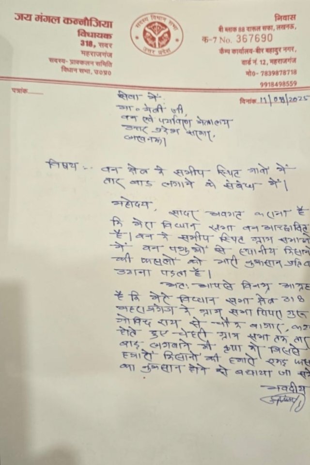 महाराजगंज 11अगस्त। सदर विधायक जय मंगल कन्नौजिया ने आज लखनऊ में विधानसभा सत्र के दौरान उत्तर प्रदेश सरकार के वन मंत्री अरूण सक्सेना शिष्टाचार भेंट की। इस अवसर पर उन्होंने अपने क्षेत्र के किसानों की एक अहम समस्या को उठाते हुए मंत्री को अवगत कराया कि वन क्षेत्र के समीप बसे गांवों के किसान लंबे समय से जंगली पशुओं द्वारा फसलों को नुकसान पहुंचाए जाने से परेशान हैं। उन्होंने बताया कि जंगली सूअर, नीलगाय एवं अन्य आवारा पशु खेतों में घुसकर किसानों की मेहनत पर पानी फेर देते हैं, जिससे उन्हें भारी आर्थिक हानि झेलनी पड़ती है। विधायक ने कहा कि किसानों की आजीविका का मुख्य साधन खेती है, और जब उनकी फसल बार-बार नष्ट होती है, तो यह न केवल उनकी आर्थिक स्थिति को कमजोर करता है, बल्कि उनके मनोबल को भी गिराता है। उन्होंने सुझाव दिया कि वन क्षेत्र से सटे गांवों में तार बाड़ (फेंसिंग) की व्यवस्था कर दी जाए जिससे जंगली और आवारा पशु खेतों में प्रवेश न कर सकें। इससे किसानों की फसल सुरक्षित रहेगी और वे निश्चिंत होकर खेती कर सकेंगे। इस संबंध में विधायक जय मंगल कन्नौजिया ने वन मंत्री को एक लिखित पत्र भी सौंपा, जिसमें उन्होंने बताया कि पिपरा गुरु गोविंद राय से चौक बाजार, कटहरा होते हुए चेहरी तक जंगल के किनारे तार बाड़ ( फेंसिंग ) कार्य जनहित में करता जाय । उन्होंने यह भी कहा कि यदि यह कार्य शीघ्र कराया जाए जिससे किसानों के धान की फसल को बचाया जा सके । वन मंत्री अरूण सक्सेना ने विधायक की मांग को गंभीरता से लेते हुए आश्वासन दिया कि इस विषय पर विभागीय स्तर पर विचार कर आवश्यक कार्रवाई की जाएगी। विधायक ने मंत्री का आभार व्यक्त किया और उम्मीद जताई कि शीघ्र ही किसानों को इस समस्या से राहत मिलेगी।