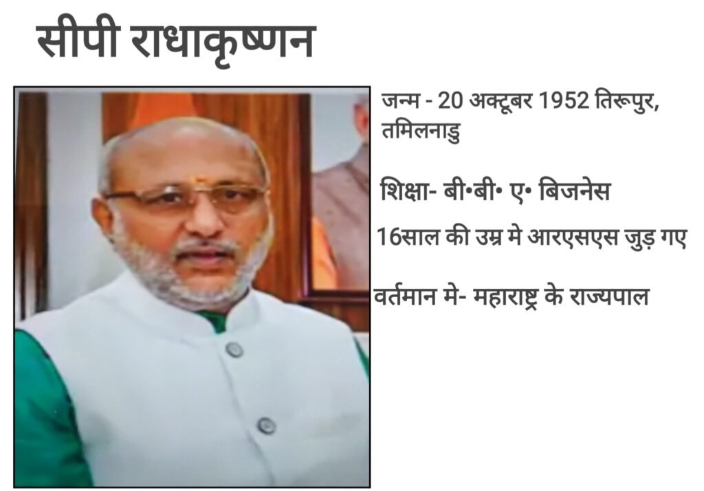 वंदेभारतलाइवटीव न्युज नागपुर -: 18 अगस्त सोमवार 2025-: प्राप्त हुई जानकारी के अनुसार सीपी राधाकृष्णन जी एनडीए गठबंधन दल के उपराष्ट्रपति पद के लिए उम्मीदवार होंगे। रविवार 17 अगस्त 2025 को भाजपा संसदीय दल की बैठक में उनके नाम का ऐलान किया गया। संसदीय दल की हुई बैठक के बाद भाजपा अध्यक्ष जेपी•नड्डा जी ने सीपी राधाकृष्णन जी का नाम उपराष्ट्रपति के लिए ऐलान किया। राधाकृष्णन जी 21 अगस्त को अपना नामांकन पत्र दाखिल करेंगे। उपराष्ट्रपति पद के लिए 09 सितंबर 2025 को होना है। चुनाव के बाद मतगणना भी उसी दिन की जायेगी। नामांकन दाखिल करने की अंतिम तारीख 21 अगस्त है। 25 अगस्त तक नाम वापस लिये जा सकते है। सीपी राधाकृष्णन जी वर्तमान मे महाराष्ट्र राज्य के राज्यपाल हैं। उनका जन्म 20 अक्टूबर 1957 को तमिलनाडु के तिरूवर में हुआ था। 16 वर्ष की आयु मे ही उन्होनें आरएसएस की शुरुआत कर दी । कोयंबटूर संसदीय क्षेत्र से वे दो बार सांसद भी रह चुकें हैं। राधाकृष्णन जी वर्ष 2004 से लेकर 2007 तक भारतीय जनता पार्टी प्रदेश अध्यक्ष रहे हैं। राधाकृष्णन जी जुलाई 2024से महाराष्ट्र राज्य के राज्यपाल है। इसके पहले वे झारखंड के राज्यपाल के थे । उपराष्ट्रपति यह चुनाव जगदीश धनखड़ के त्याग पत्र देने के कारण हो रहा है। जगदीश धनखड़ ने 21 जुलाई 2025 को अपने पद से त्यागपत्र पत्र दे दिया था।