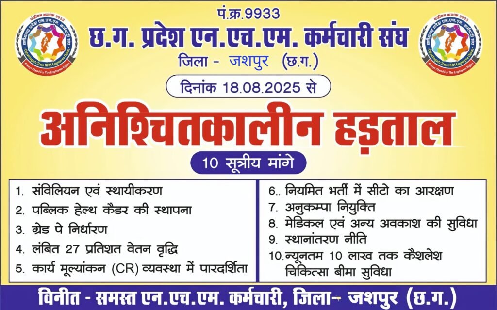 जशपुर : छत्तीसगढ़ एन.एच.एम.कर्मचारी संघ के बैनर तले जिला एन.एच.एम. संघ जशपुर, इकाई अपनी वर्षों से चली आ रही नियमितीकरण सहित 10 सूत्रीय मांगों हेतु विगत कई वर्षो से तथा वर्तमान सरकार सहित छत्तीसगढ़ प्रदेश के समस्त मंत्री/विधायकों सहित शासन स्तर के समस्त सक्षम अधिकारियों से अपनी मांगों को पूरा करने के लिए विभिन्न माध्यमों ज्ञापन/ पत्र/ आवेदन आदि के द्वारा अनुनय-विनय किया गया फिर भी शासन पक्ष से किसी भी प्रकार का निराकरण नहीं किया गया। जिससे बाध्य होकर छत्तीसगढ़ प्रदेश के सभी एन.एच.एम. अधिकारी/कर्मचारी आज दिनांक 18 अगस्त 2025 से अनिश्चितकालीन हड़ताल पर है।