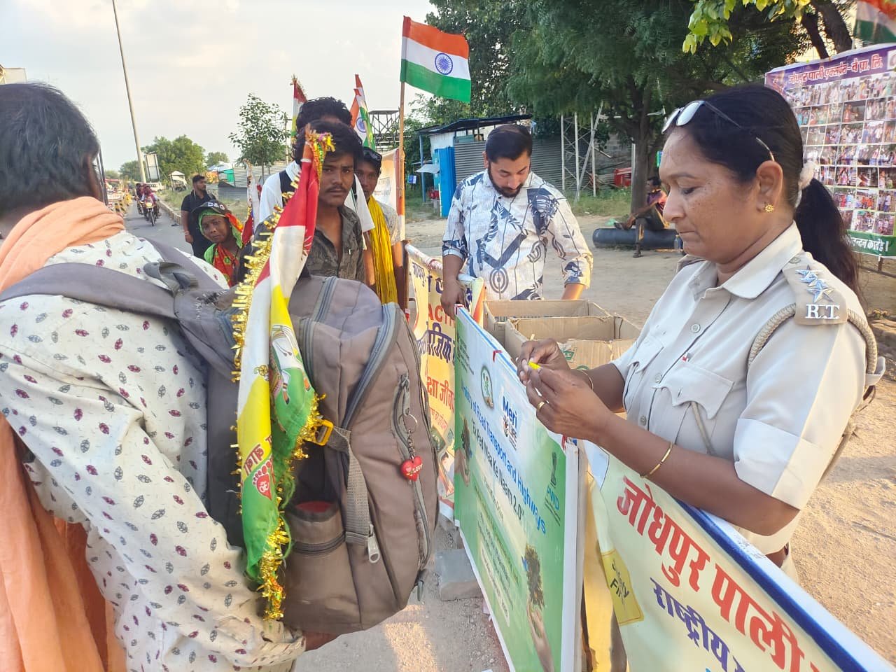 पाली:शासन की सर्वोच्च प्राथमिकता सड़क सुरक्षा जीवन रक्षा के तहत् पुलिस अधीक्षक पाली पूजा अवाना के निर्देशानुसार जोधपुर पाली फोरलेन प्रबंधन के श्रीकांत के संयुक्त तत्वावधान में प्रतिदिन चलाए जा रहे सड़क सुरक्षा जीवन रक्षा अभियान की कड़ी में आज स्थानीय गाजनगढ़ टोल प्लाजा पर कार्यक्रम आयोजित किया गया। कार्यक्रम में परिवहन निरीक्षक मीनाक्षी कैथरीन ने रामदेवरा जा रहे जातरू एवं आम जन को सुरक्षित यात्रा करने का संदेश दिया साथ ही ट्रैफिक के नियमों का पालन करने के साथ अपनी सुरक्षा के साथ दूसरे की सुरक्षा का ध्यान रखें, सीएसआर मैनेजर फिरोज़ ख़ान ने बताया कि दैनिक आधार पर रेडियम बेल्ट रामदेवरा मेला जा रहे जातरूओ के हाथों मे रेडियम हैड बैल्ट एवं उनके बैग के पीछे रेडियम स्टिकर एवं हैंड बेल्ट के कारण रात में वाहन चालकों को ये रेडियम स्टिकर दूर से दिखाई देंगे जिससे ड्राइवर सतर्क हो जायेंगे साथ ही रात के अंधेरे में दुघर्टना होने की संभावना कम हो जायेगी इस मौके पर ब्रजेश सिंह सहित टोल कर्मचारी उपस्थित रहे