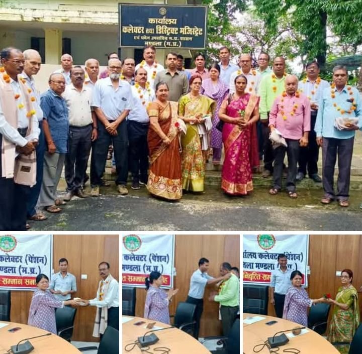 मंडला कलेक्टर श्री सोमेश मिश्रा जुलाई माह 2025 में अलग अलग कार्यालयों से सेवानिवृति हुए 22 शासकीय कर्मचारियों सम्मान एवं पीपीओ वितरण किया कलेक्टर ने पीपीओ वितरण के साथ सेवानिवृति शासकीय कर्मचारियों को उनके भावी जीवन के लिए शुभकामनाएं दी इस अवसर पर डिप्टी कलेक्टर श्रीमती क्षमा सराफ जिला कोषालय अखिलेश नेटी जिला पेंशन अधिकारी अविनाश नागले सहित सेवानिवृति कर्मचारियों के परिजन मौजूद रहे कलेक्टर श्री सोमेश मिश्रा द्वारा जिन सेवानिवृत कर्मचारियों को पीपीओ वितरित किए गए है उनमें बीईओ कार्यालय मंडला में श्री महेश कुमार नामदेव श्रीमती प्रतिमा सोनी श्री राजेंद्र कुमार रजक श्री भीखम लाल सिंगार श्री राजेश कुमार शुक्ला श्री दिनेश कुमार दुबे श्रीमती चित्रलेखा ठाकुर श्रीमती निशा सिहरे श्रीमती निकम तिवारी बी ई ओ कार्यालय बिछिया से श्री निरंजन कुमार शाहू श्री घनश्याम प्रसाद झरिया श्री सुनील कुमार शुक्ला श्री राम कुमार नंदा श्री रणजीत सिंह मरकाम श्री नेमसिंह चौधरी बी ई ओ कार्यालय नैनपुर से श्री नारायण धुर्वे श्रीमती सरला वंशकार श्री प्रहलाद सिंह मालगांव श्री महेंद्र कुमार राजपूत श्री फूलचंद मरावी मुख्य चिकित्सा एवं स्वास्थ्य अधिकारी श्रीमती मंजू माला साइमन आरडी कॉलेज मंडला से श्री श्रीकांत श्रीवास्तव शामिल रहे