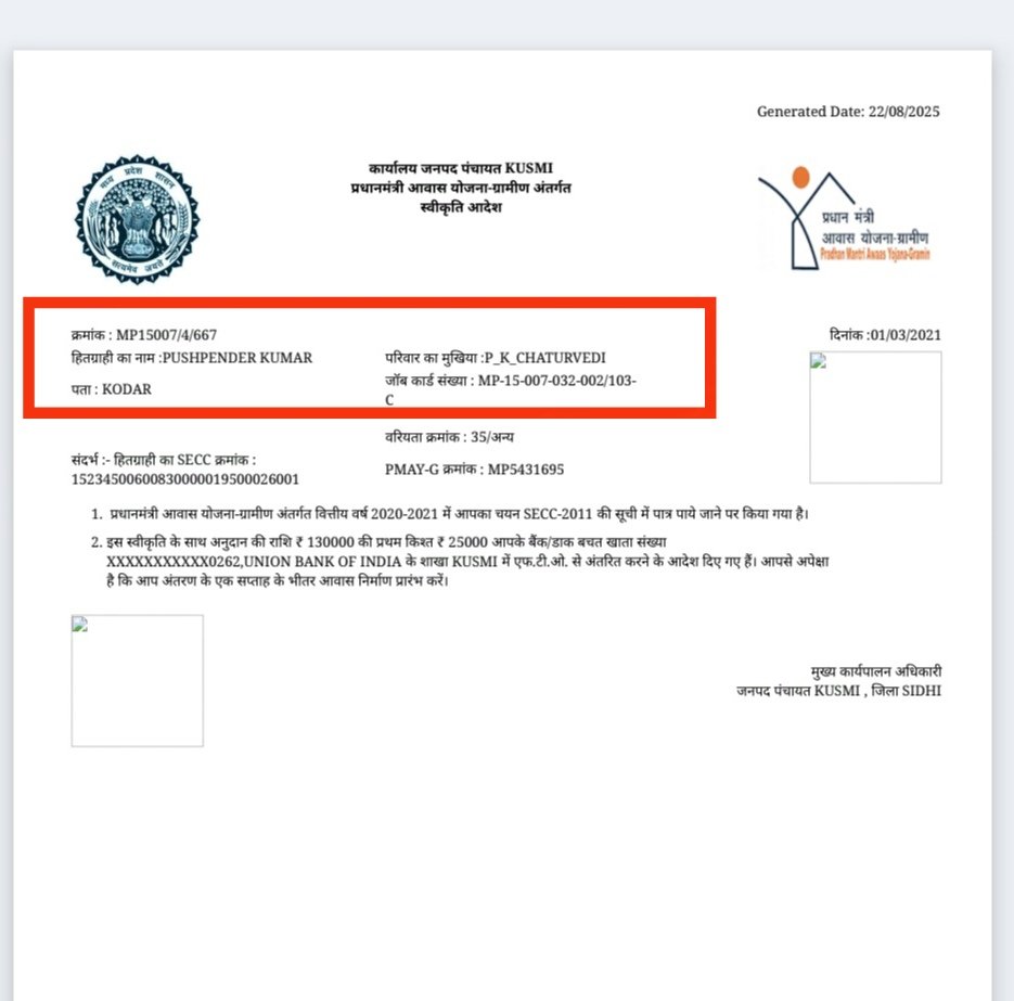 इतना ही नहीं प्रधानमंत्री आवास योजना के तहत स्वीकृत पंजीयन संख्या 5431695 किसी पुष्पेंदर कुमार पिता पी के चतुर्वेदी के नाम पर है जिसमें जॉब कार्ड संख्या एमपी- 15-007-032-002/103-C दर्ज है जो कि आशीष कुमार चतुर्वेदी पिता नीरेश के नाम पर है। रोजगार सहायक रजनीश कुमार द्विवेदी द्वारा एक लंबे अरसे से खेले जा रहे फर्जीवाडे के इस खेल के खुलासे के बावजूद भी सीधी जिला प्रशासन की चुप्पी चिंताजनक है।