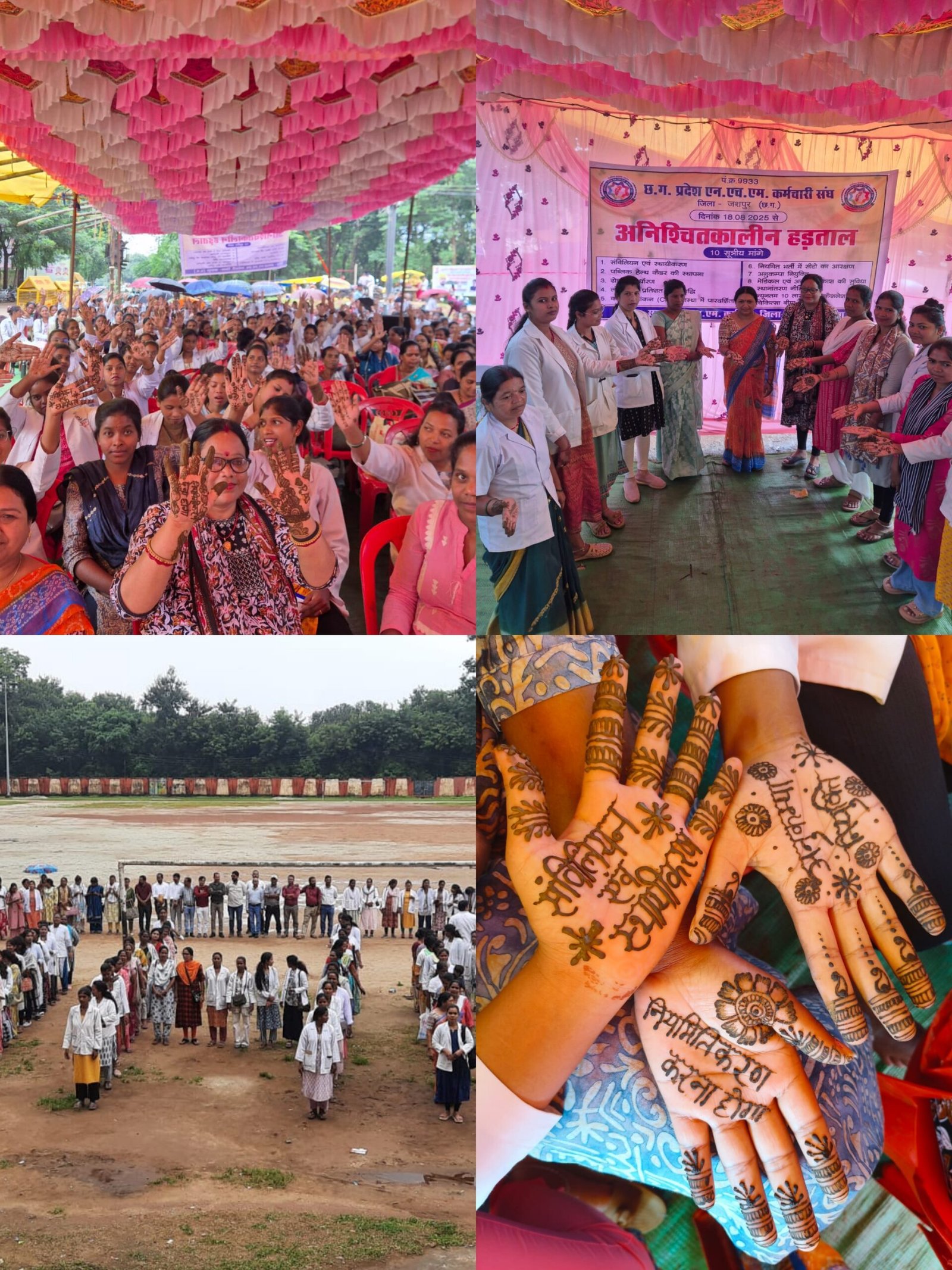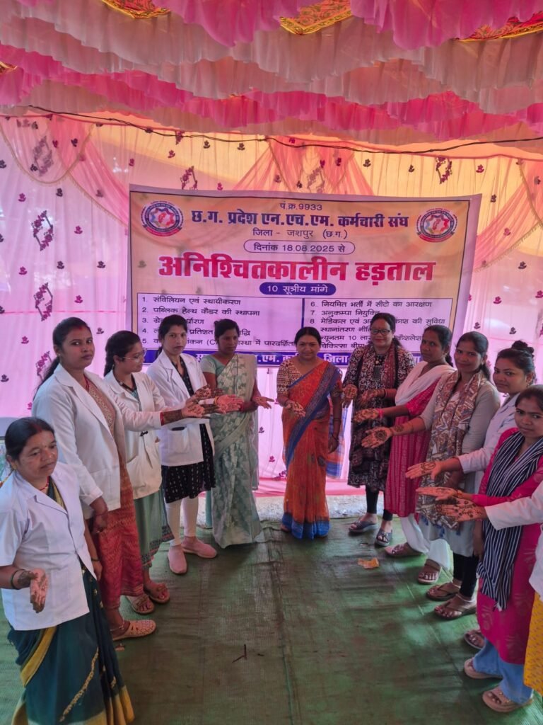 जशपूर – जिले के लगभग 800 से अधिक व पूरे प्रदेश के 18000 से अधिक एनएचएम अधिकारी,कर्मचारी भारी बारिश और मौसम कि मार झेलते हुए भी अपनी नियमितीकरण सहित 10 सूत्रीय मांगों संविलयन , ग्रेड पे, अनुकंपा नियुक्ति, पब्लिक हेल्थ कैडर, कार्य मूल्यांकन में पारदर्शिता, स्वास्थ्य बीमा, अवकाश सुविधा, मेडिकल अवकाश, स्थानांतरण नीति, नियमित पद में आरक्षण के पूरे होने की आस में हड़ताल स्थल में अब भी पूरे उत्साह व जोश के साथ डटे हुए हैं। उनका कहना है कि जब तक शासन स्तर से लिखित में हमारे मांगों के पक्ष मे आदेश नहीं आ जाता तब तक हड़ताल समाप्त नहीं होगा।