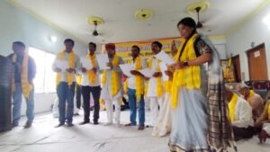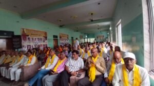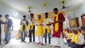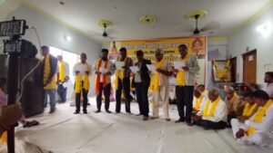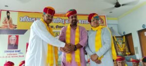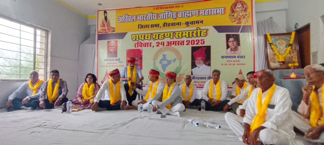ङीङवाणा-कुचामन जिले में अखिल भारतीय जांगिड़ ब्राह्मण महासभा जिला शाखा डीडवाना कुचामन कार्यकारिणी का शपथ ग्रहण समारोह ग्राम मंगलाना में किशनगढ़ रोड स्थित श्री गोपाल गौशाला शाला में समारोह पूर्वक संपन्न हुआ। इस दौरान वक्ताओं द्वारा समाज विकास को लेकर बातें कही गई वही समाज बंधुओं द्वारा भामाशाहों का सम्मान किया गया। समारोह का शुभारंभ भगवान श्री विश्वकर्मा के चित्र पर माल्यार्पण एवं दीप प्रज्वलन करने सहित आरती से हुआ तदर्थ अतिथियों द्वारा नवगठित कार्यकारिणी के पदाधिकारियों को उनके दायित्वों एवं कर्तव्यों के प्रति शपथ दिलाई गई। इस दौरान विशिष्ट अतिथि के रूप में शामिल राजस्थान सरकार के पूर्व मुख्य सचेतक महेंद्र चौधरी ने नवगठित कार्यकारिणी को बधाई देते हुए कहा कि हर एक समाज के लिए जरूरी है कि वह समाज विकास के लिए संगठित होकर ऐसा राजनीतिक निर्णय भी ले जो समाज के लिए लाभदायक हो। मुख्य अतिथि अखिल भारतीय जांगिड़ ब्राह्मण महासभा दिल्ली के कार्यकारी प्रधान लादूराम सीदड ने इस दौरान सामाजिक उत्थान के लिए एकजुट होकर अपना दायित्व निभाने पर बल दिया वही महिला प्रदेशाध्यक्ष रेणु जांगिड़ ने बच्चों को संस्कारवान बनाने सहित उच्च शिक्षा दिलाने की बात कही। समारोह को प्रदेश अध्यक्ष घनश्याम पंवार तथा बरवाली सरपंच महेश जांगिड़ ने भी संबोधित किया। इस दौरान परबतसर में बन रहे समाज छात्रावास में 51 लाख रुपए का आर्थिक सहयोग प्रदान करने पर लादूराम सीदड (कार्यकारी प्रधान अखिल भारतीय जांगिड़ ब्राह्मण महासभा दिल्ली) का समाज बंधुओं द्वारा माला एवं साफा पहनाकर सम्मान किया गया। मंच संचालन संयुक्त रूप से सत्यनारायण नागल तथा श्याम सुंदर निशान द्वारा किया गया। इस दौरान डीडवाना कुचामन जिला सहित प्रदेश के विभिन्न स्थानों से आए समाज बंधु शामिल रहे।