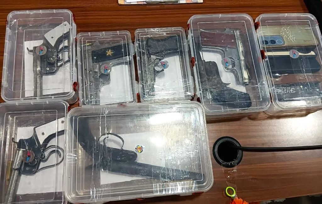 विवरण वरामदगी= 03 अदद पिस्टल 32 बोर, 03 अदद तमंचा 315 बोर, 01 अदद तमंचा 12 बोर, 01 अदद कारतूस (7.65 बोर), 02 अदद कारतूस 315 बोर, 01 अदद कारतूस 12 बोर, 03 अदद कारतूस 32, 03 अदद मैग्जीन व 06 अदद मोबाइल फोन बरामद।