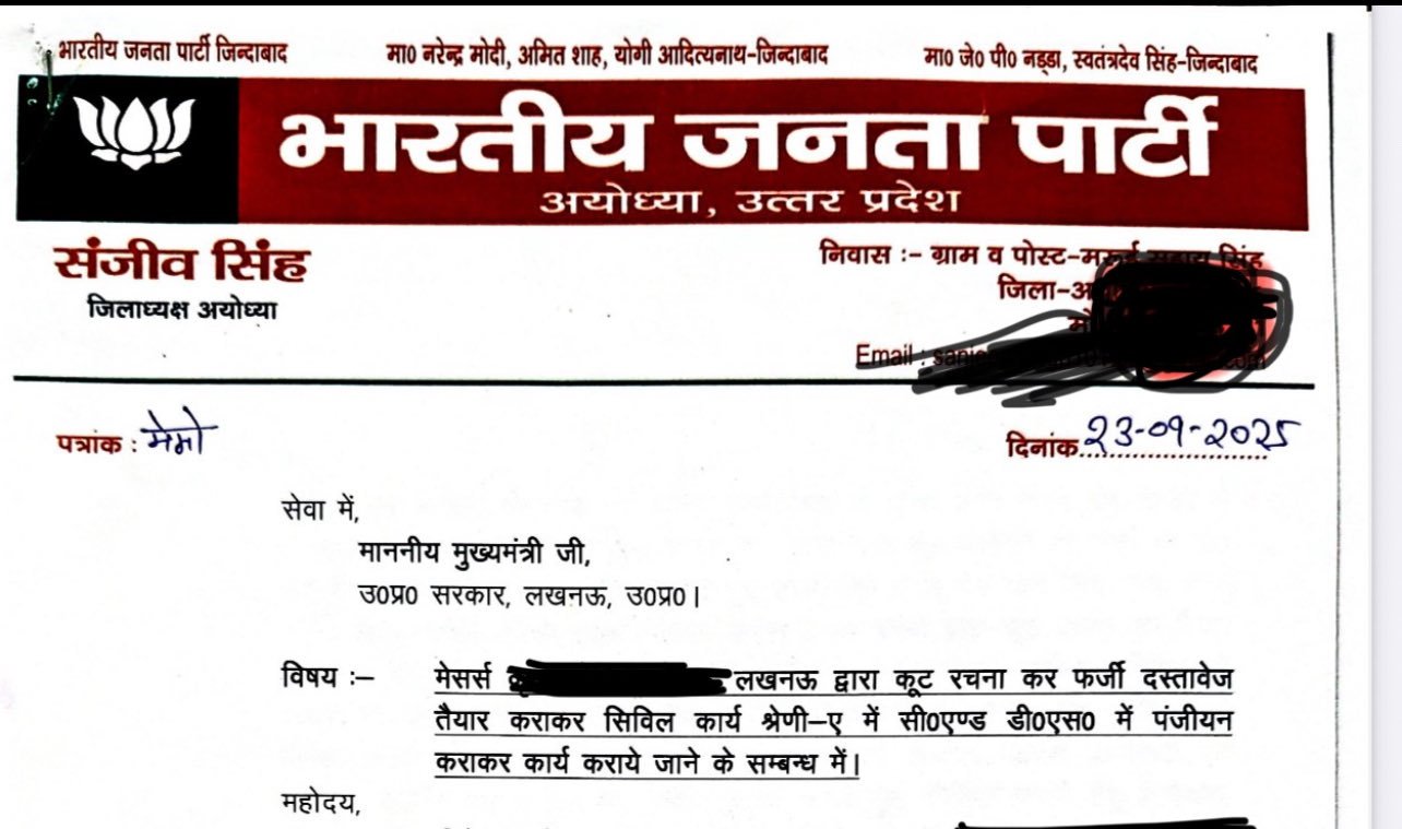 बीजेपी के ज़िलाध्यक्ष संजीव सिंह ने अयोध्या के टेंडरों में हो रहे फर्जीवाड़े का मुद्दा उठाया