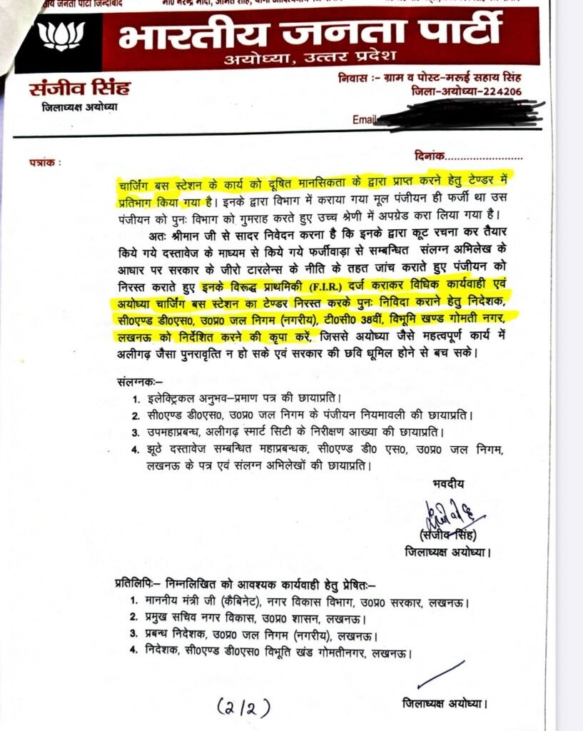 चिट्ठी में लिखा कि अयोध्या चार्जिंग बस स्टेशन के टेंडर की खातिर कंपनी द्वारा फर्जी दस्तावेज लगाए गए हैं।कूट रचना करके दस्तावेज लगाए हैं।